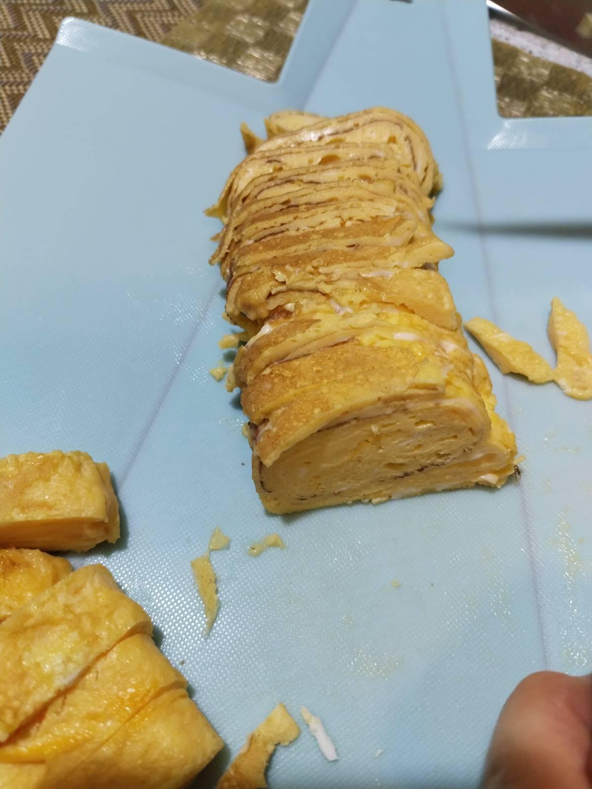 เริ่มจากทำ Tamagoyaki (玉子焼き) ใช้ไข่ไก่ 3-4 ฟอง ใส่เหล้าสาเกกับเกลือ นิดนึง