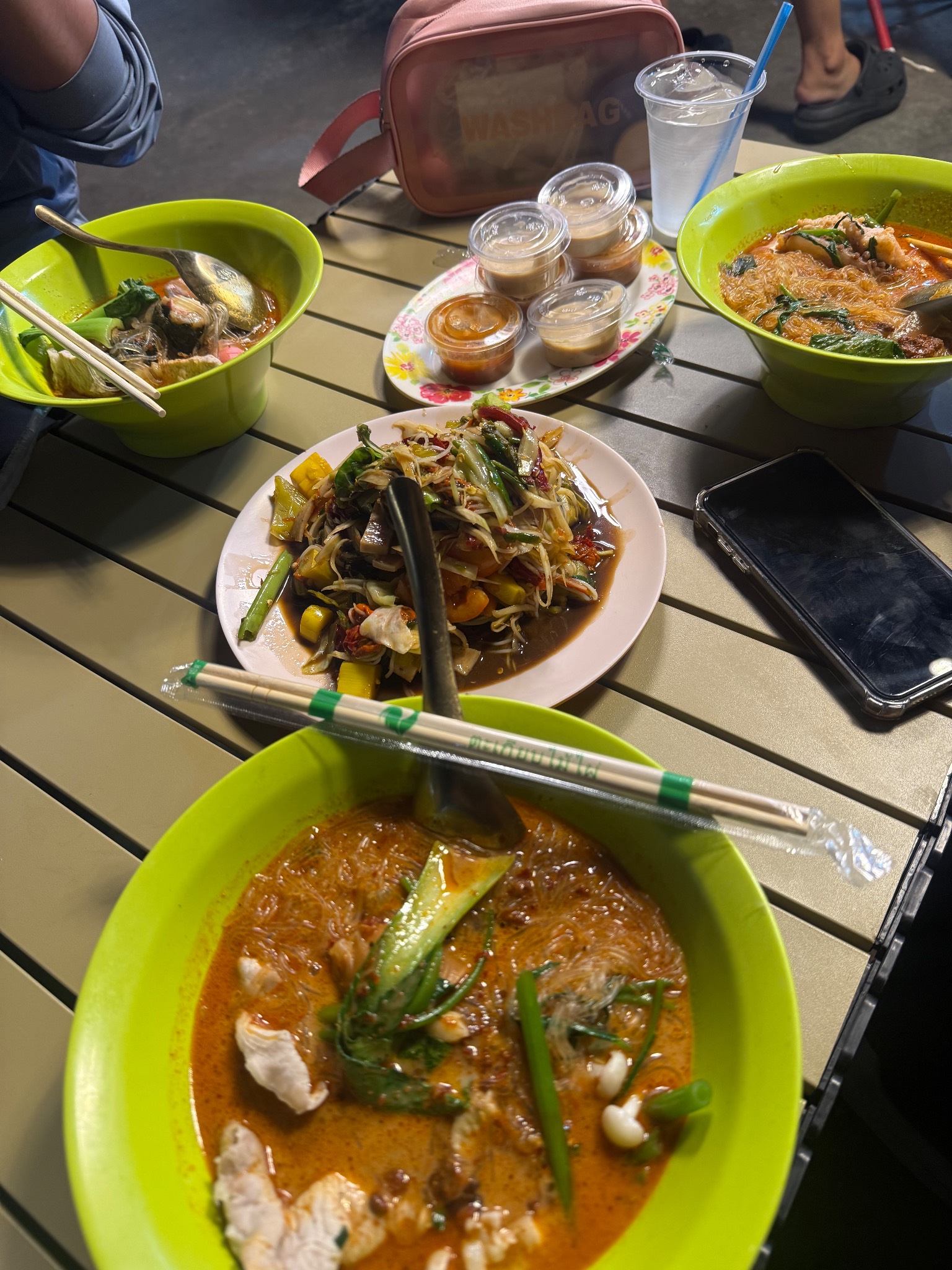เด็กน้อยแถวบ้านกำลังจะคน ๆ ตักกิน ทีแรกเรานึกว่าสปาเก็ตตี้ แต่เส้นสีแจ่มขนาดนี้ น่าจะไม่ใช่แล้ว กลิ่นก็ไม่ใช่อาหารฝรั่ง กลิ่นเหมือนอะไรสักอย่าง บอกไม่ถูกเหมือนกัน ถามเด็กน้อยว่าเค้าเรียกว่าอะไรคะหนู เ