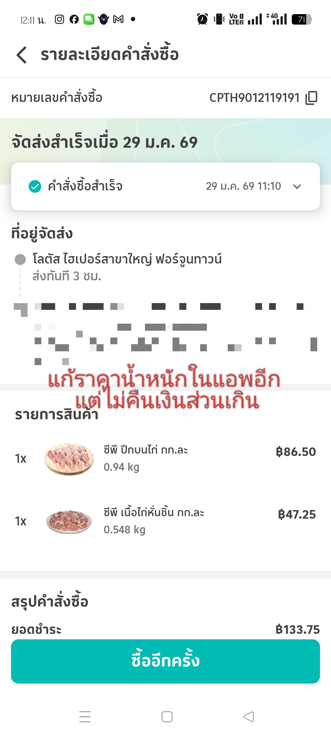 วันนี้สั่งของในแอพโลตัสเลือกเป็นเนื้อไก่หั่นชิ้นกับเนื้อไก่ปีกบนไปแบบชั่งกิโล แต่ได้ของมาน้ำหนักไม่ถึงเท่าที่สั่งไป และนี่ไม่ใช่ครั้งแรก เสียความรู้สึกมาก ครั้งแรกยังปล่อยผ่านได้ครั้งที่สองปล่อยไม่ได้แล้วค่ะ เงินก็เก็บไปเต็มแบบนี้จะให้มีเลือกน้ำหนักไว้ทำไมคะถ้าจะใส่ของมาไม่ครบน้ำหนัก แย่มากค่ะ เข้าใจว่าจะตักของให้เท่าตามน้ำหนักมันยาก เพราะหั่นแบ่งไม่ได้ ถ้าตักเกินจะคิดเงินเพิ่มตามที่แอพบอกก็ไม่ได้ว่าค่ะ แต่ถ้าตักไม่ถึง เงินส่วนที่ไม่ได้คิดก็ควรคืนสิ💢💢
