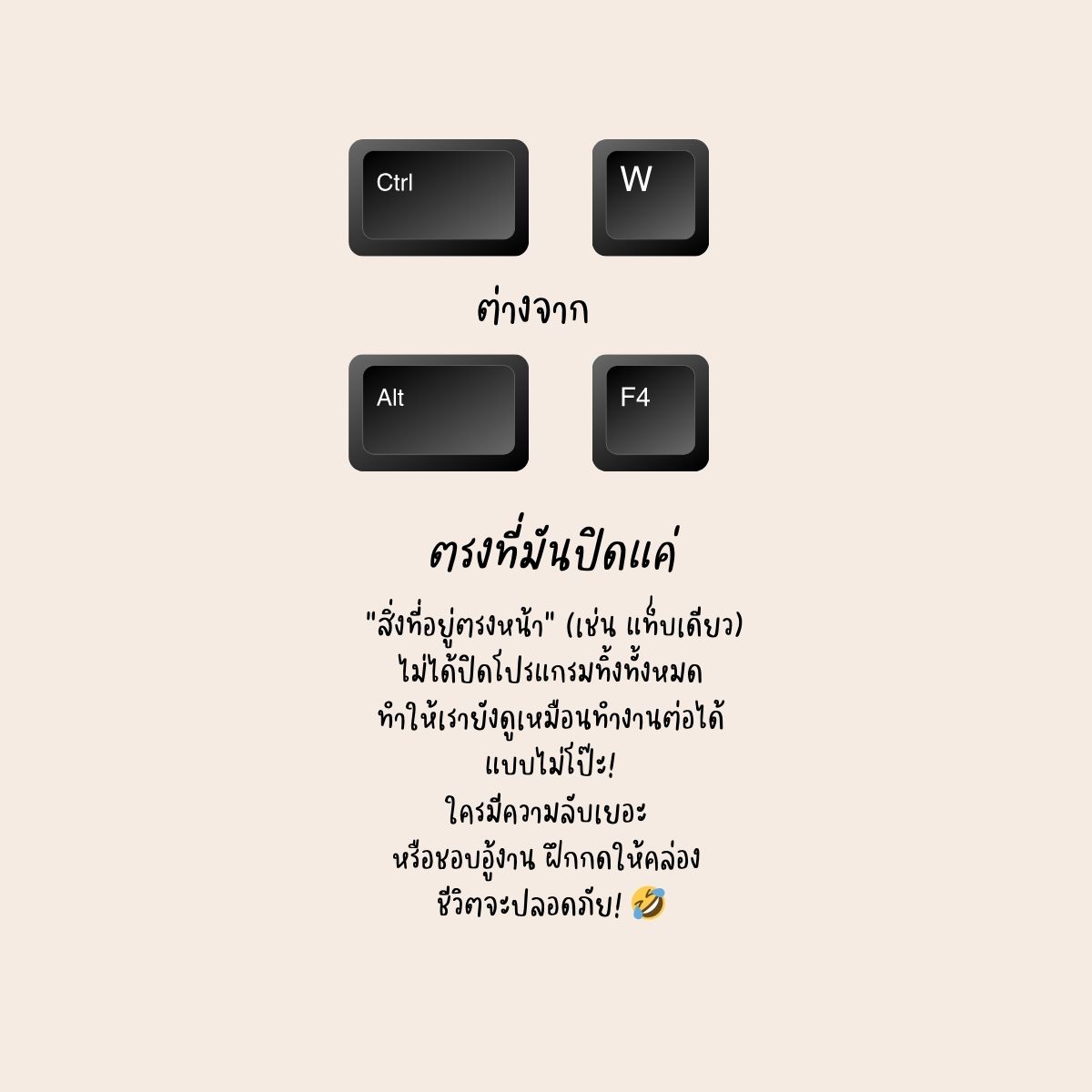 Alt + F4 ซึ่งอันนี้คือโหดกว่า 😅 Alt + F4 = ปิดทั้งโปรแกรม บางทีปิดแบบยังไม่ได้เซฟ หัวหน้ามองมา = เสียวกว่าเดิม แต่… Ctrl + W =ปิดแค่ “หน้าที่อยู่ตรงหน้า” ปิดแค่แท็บเดียว โปรแกรมหลักยังเปิดอยู่ ยังดูเหมือนตั้งใจทำงานต่อได้เนียนๆ สายแอบ สายอู้ สายเปิดหลายแท็บ ตัวนี้คือของจริง 😂