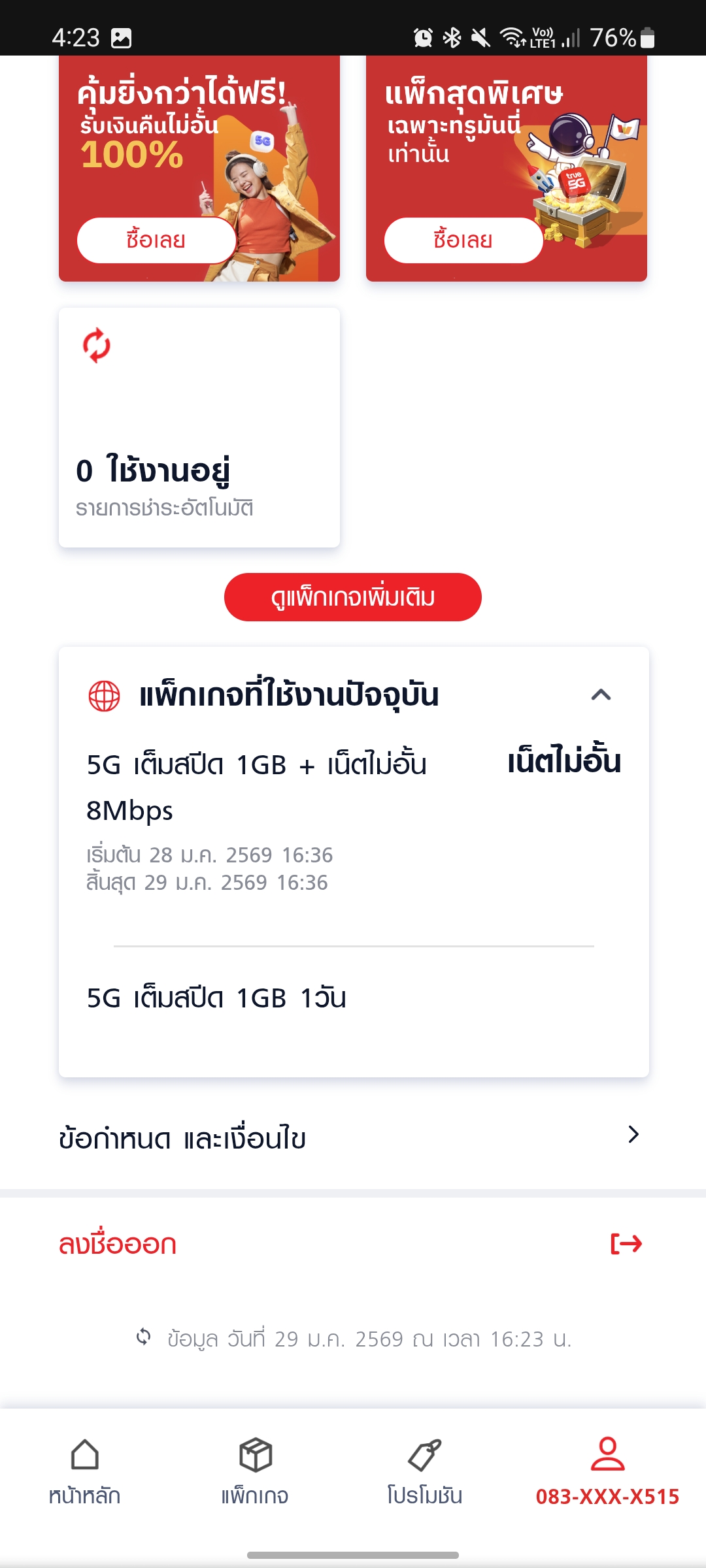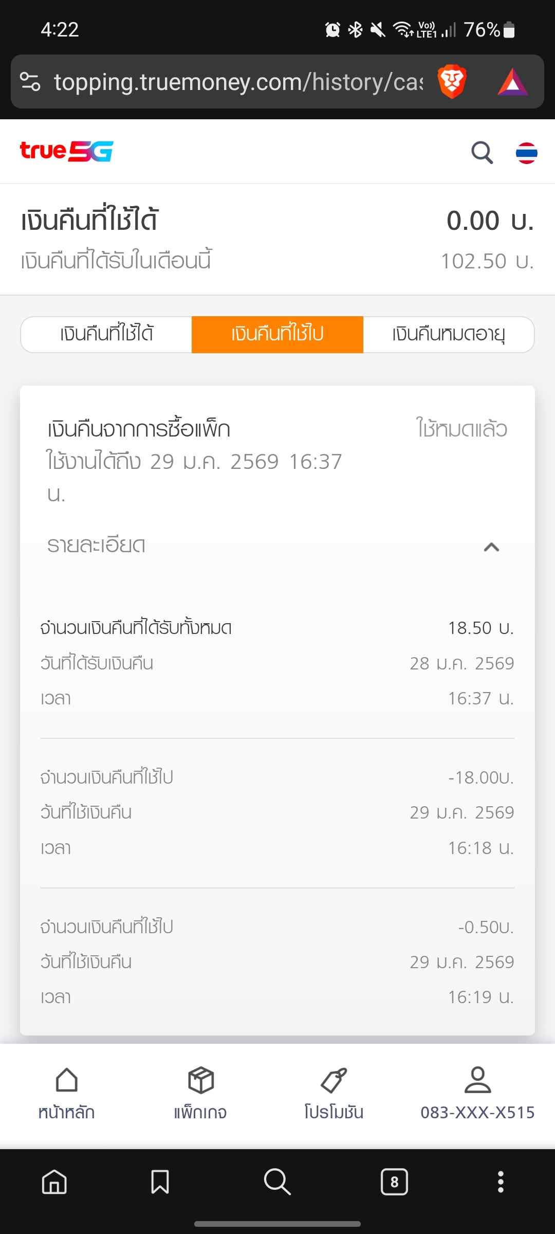 เมื่อวานหยิบเครื่องสำรองออกไปข้างนอกเลยเติมเงินแพ็คเกือบ 40 บาท ได้เงินคืน 18 บาท ที่จะหมดอายุนอน 16:38 น. เลยสมัครแพ็ค 500 mb เล่น ๆ เพราะปล่อยเงินคืนหมดอายุไปสิบกว่ารอบ ซื้อผ่านเว็บที่ทรูแนบลิ้งใน sms ระบบขึ้นว่าขัดข้อง แล้วก็ตัดเงินไปเลย เช็คแพ็คแล้วไม่ขึ้น sms แจ้งสมัครแพ็คก็ไม่มี ถ้าบอกว่าเป็นเงินคืนแต่พอใช้จริงแล้วล่องหนเนี่ยไม่ต้องมีก็ได้นะ
