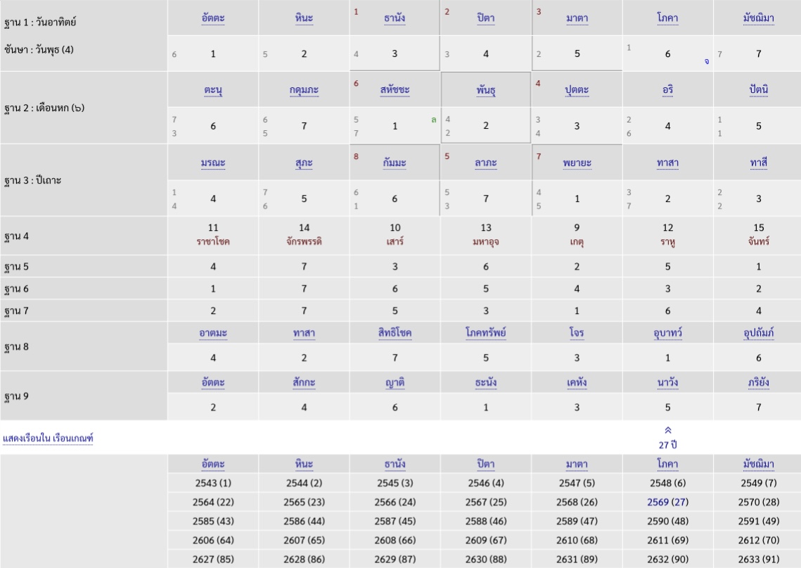 เกิดวันพุธ เดือนกุมภาฯ ปีวอก (11/2/2524) ฐาน 1 อัตตะ หินะ ธานัง ปิตา มาตา โภคา มัชฌิมา 4 5 6 7 1 2 3 ฐาน 2 ตะนุ กดุมภะ สหัชชะ พันธุ ปุตตะ อริ ปัตนิ 3 4 5 6 7 1 2 ฐาน 3 มรณะ สุภะ กัมมะ ลาภะ พยายะ