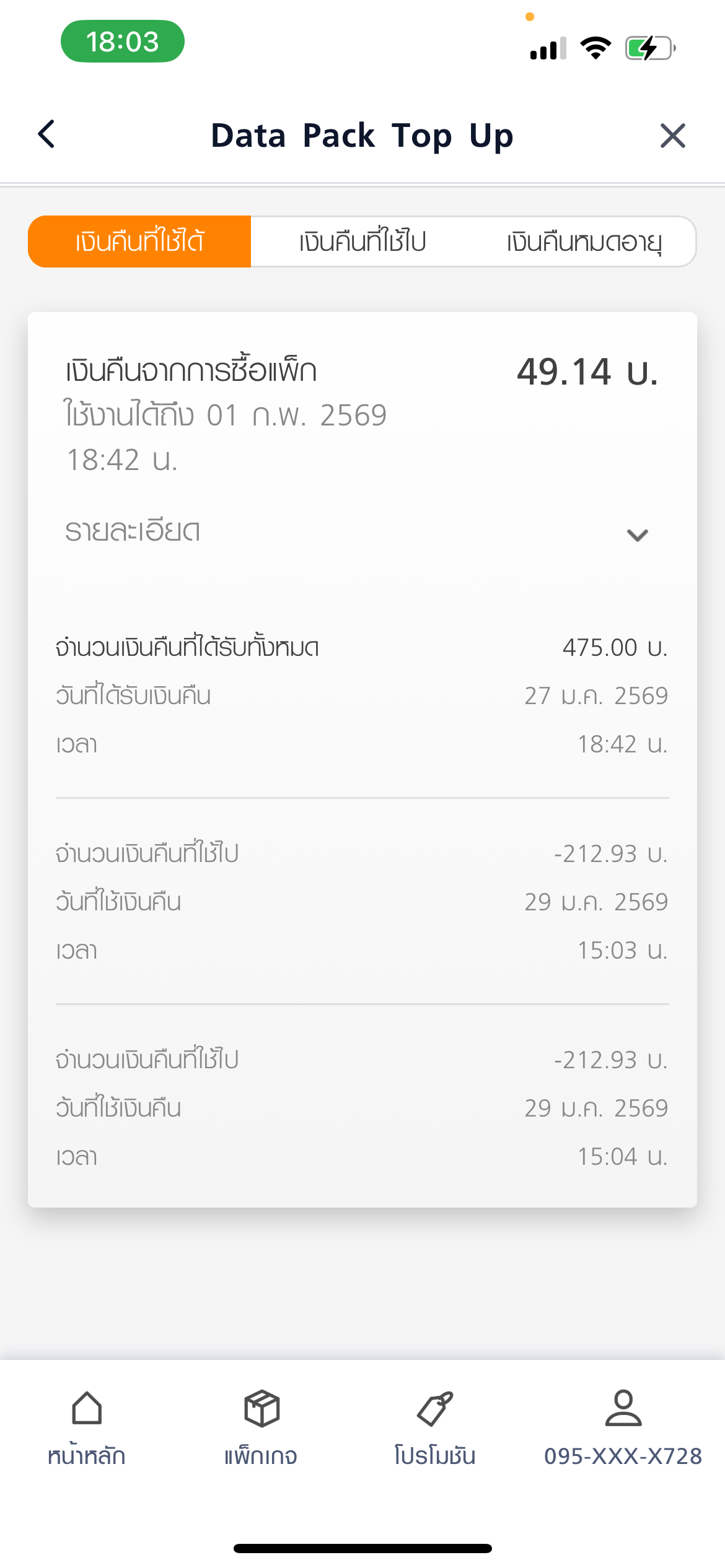 ซื้อแพ็คเกจโดยใช้เงินคืนของทรูโดนหักยอดแล้วแต่ใช้ไม่ได้