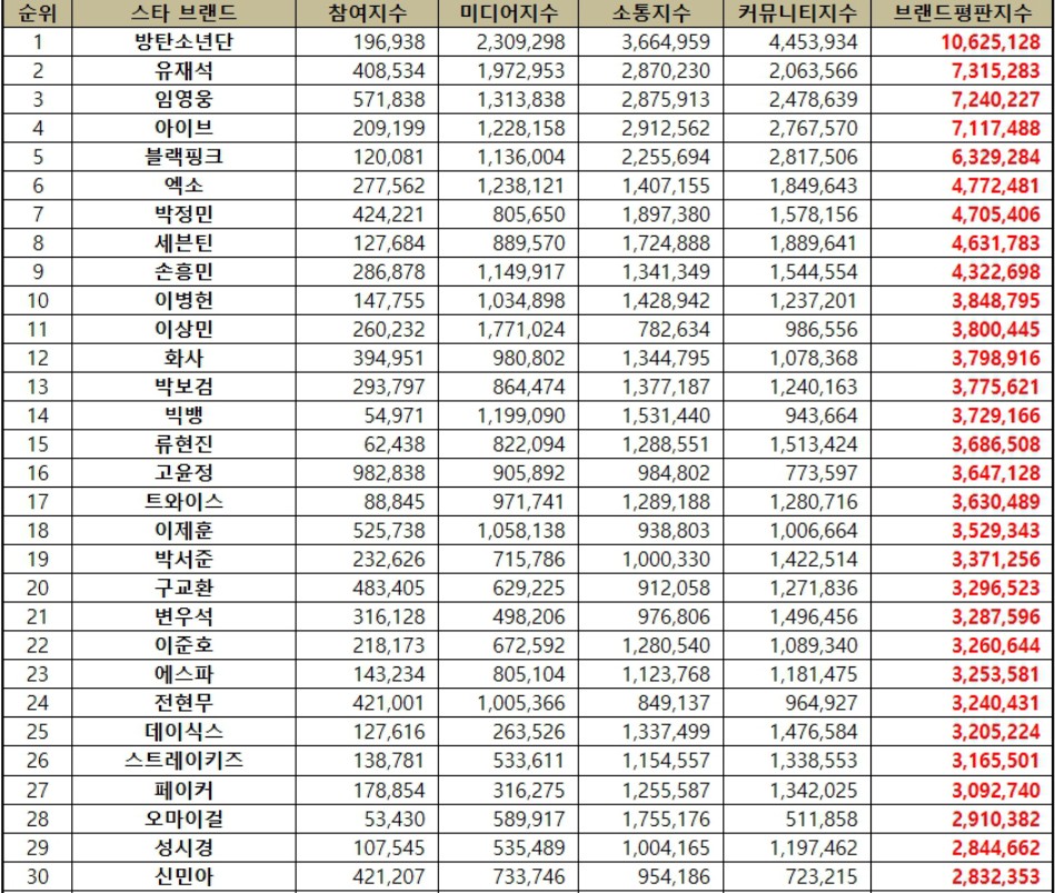 อันดับ 1 ได้แก่ BTS ซึ่งมีดัชนีชื่อเสียงแบรนด์อยู่ที่ 10,625,128 โดยมีดัชนีการมีส่วนร่วม 196,938 ดัชนีสื่อ 2,309,298 ดัชนีการสื่อสาร 3,664,959 และดัชนีชุมชน 4,453,934 เมื่อเทียบกับดัชนีชื่อเสียงแบรนด์ 6,524,949 ในเดือนธันวาคม เพิ่มขึ้น 62.84%