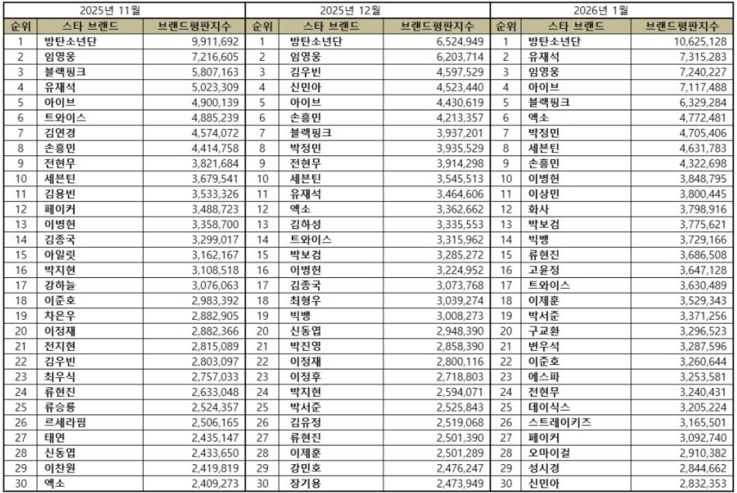 ✨ Star Brand Reputation ประจำเดือนมกราคมปี 2026 : อันดับ 1 BTS , อันดับ 2 ยู แจซอก , อันดับ 3 อิม ยองอุง
