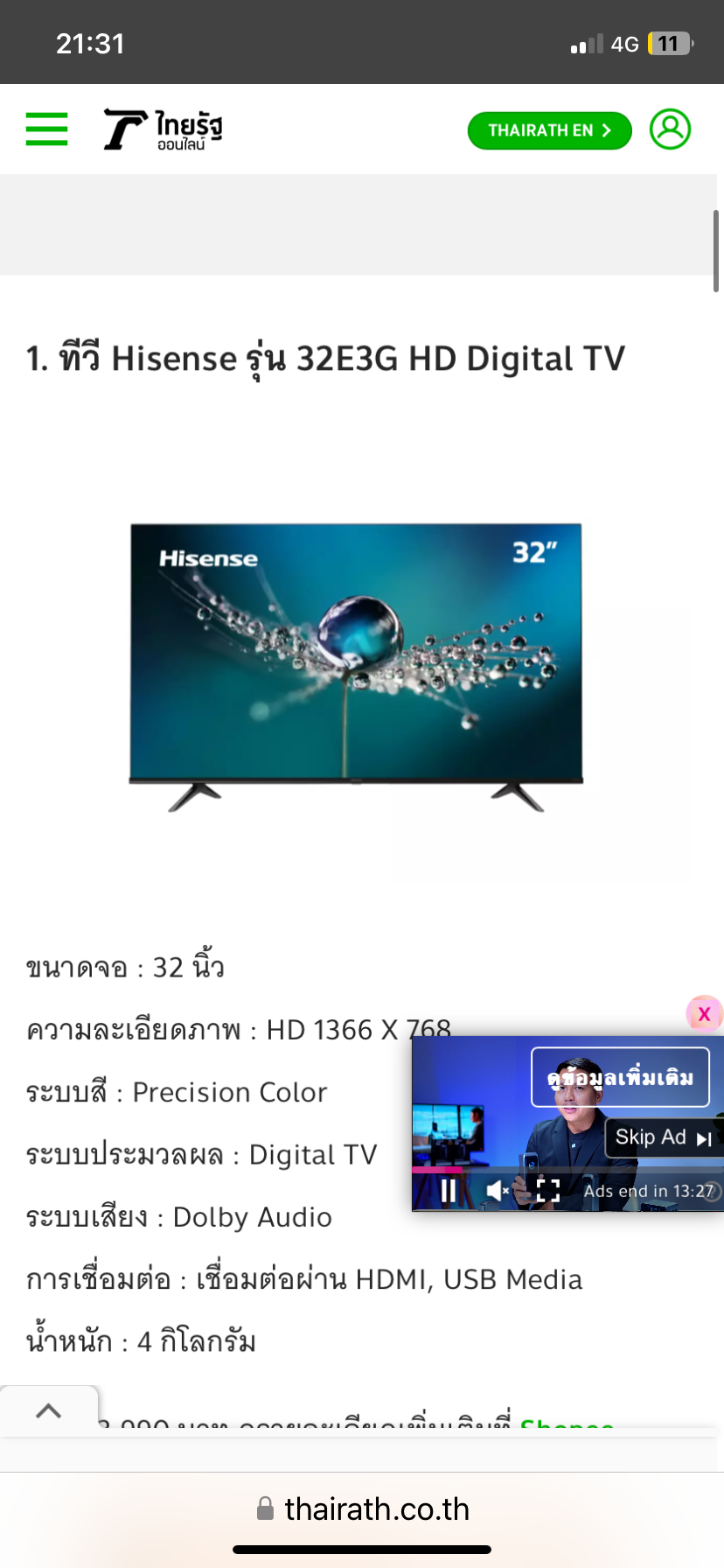 ทีวี hisense smart tv 32 นิ้ว เปิดเพิ่มเสียงแล้วเด้ง