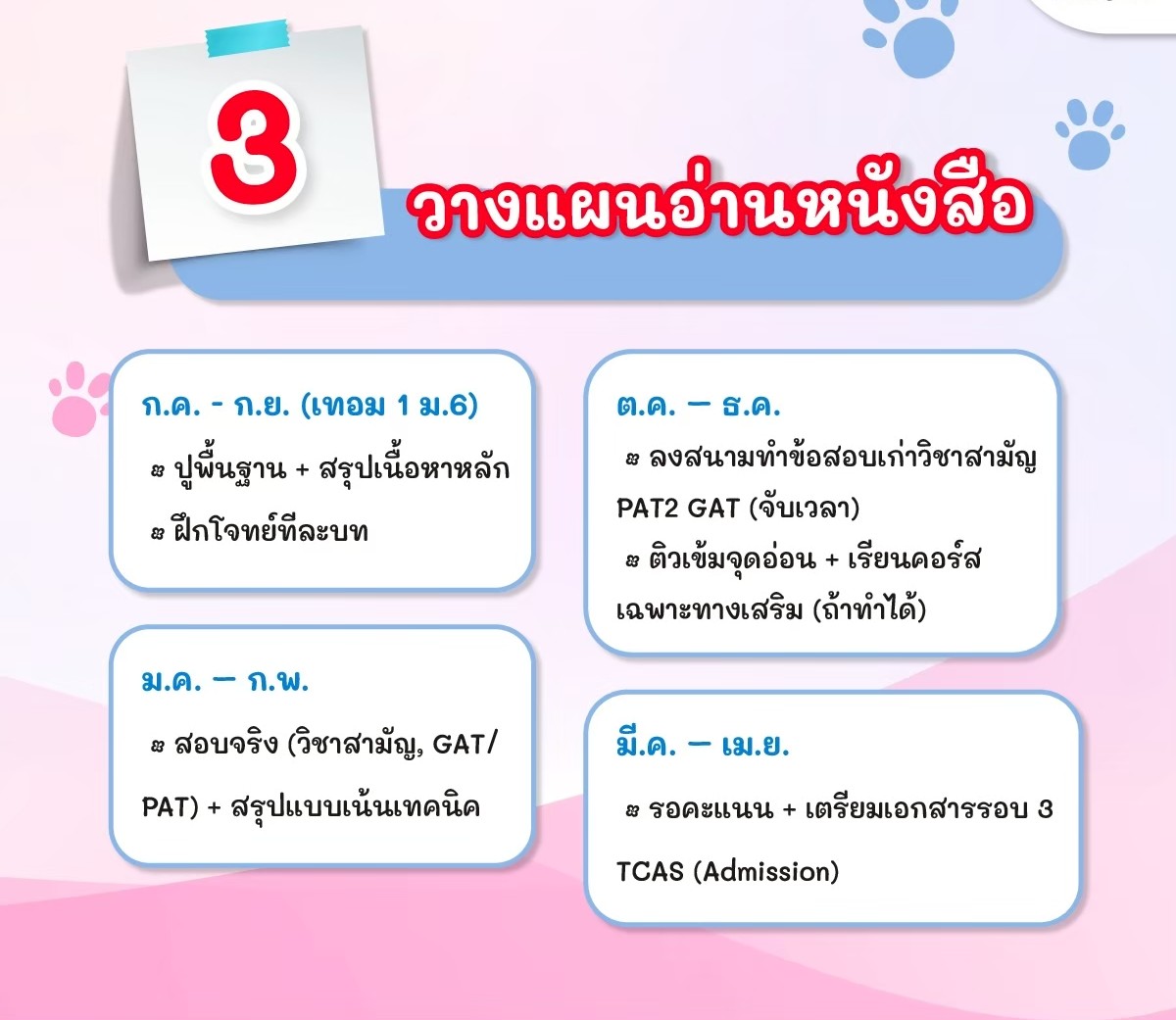 • Study Plan 12 เดือน: กรกฎาคมถึงเมษายน ต้องเก็บเนื้อหาตอนไหน ฝึกโจทย์เมื่อไหร่ ไม่ให้ลนช่วงใกล้สอบ