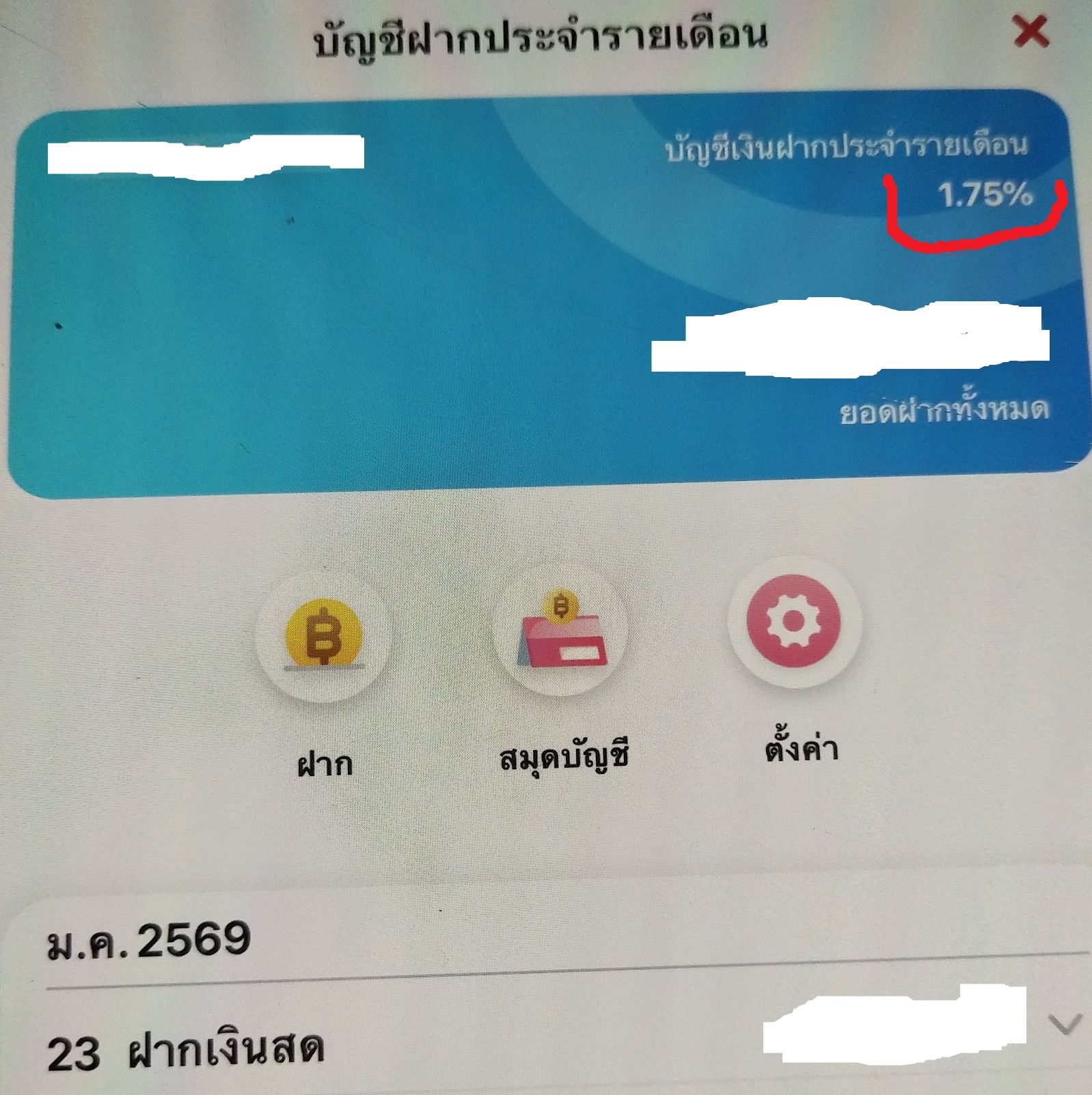 เดือนธันวาคมนี้จะครบสองปีในการฝากประจำปลอดภาษี 24 เดือนค่ะ ตอนเริ่มฝาก ดอกเบี้ย 2.05% ตอนนี้เราไปเช็คในแอพ ดอกเบี้ยเหลือ 1.85% พอมาค้นข้อมูลดูก็เลยเพิ่งรู้ว่า บัญชีเงินฝากปลอดภาษี มีแบบดอกเบี้ยคงที