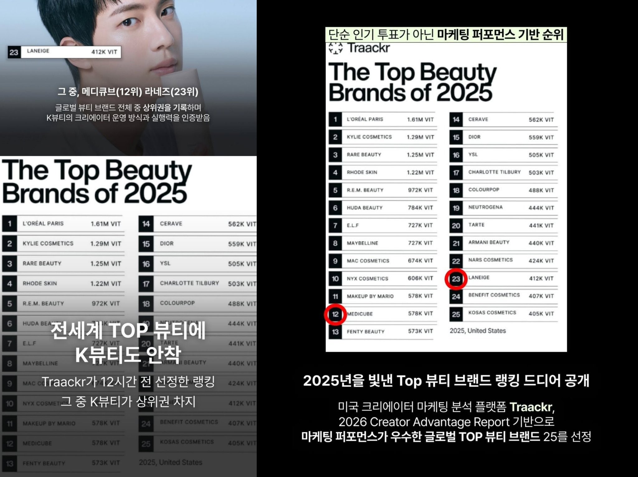 ในการจัดอันดับครั้งนี้ Laneige เข้าสู่อันดับที่ 23 ด้วยคะแนน 412K VIT เคียงข้างไปกับแบรนด์ยักษ์ใหญ่อย่าง L’Oréal, Rare Beauty และ Kylie Cosmetics ซึ่งความน่าภาคภูมิใจคือ ในบรรดา 25 อันดับนี้ มีเพียง Laneige และ Medicube (อันดับ 12) เท่านั้นที่เป็นแบรนด์สัญชาติเกาหลีที่ได้รับเลือก