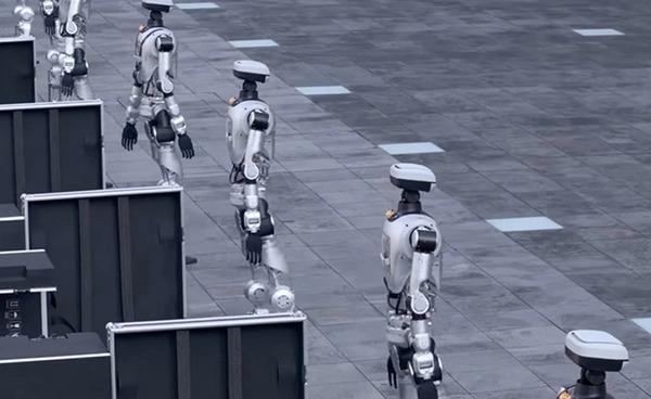 นับเป็นครั้งแรกของโลกที่มีการนำหุ่นยนต์มนุษย์จำนวนมากถึง 18 ตัว ออกจากกล่องขนส่ง ลุกขึ้น เดิน เคลื่อนที่เป็นขบวน
