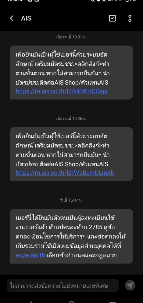มีใครได้รับ SMS จาก AIS ไหมคะ ว่าหมายเลขนี้ข้อมูลลงทะเบียนซิมไม่สมบูรณ์ตามประกาศ กสทช. กรุณาปรับปรุงข้อมูลโดยยืนยันตัวตนใหม่ มันมาจากAISจริงๆใช่ไหม แล้วต้องดำเนินการณ์ยังไงคะ