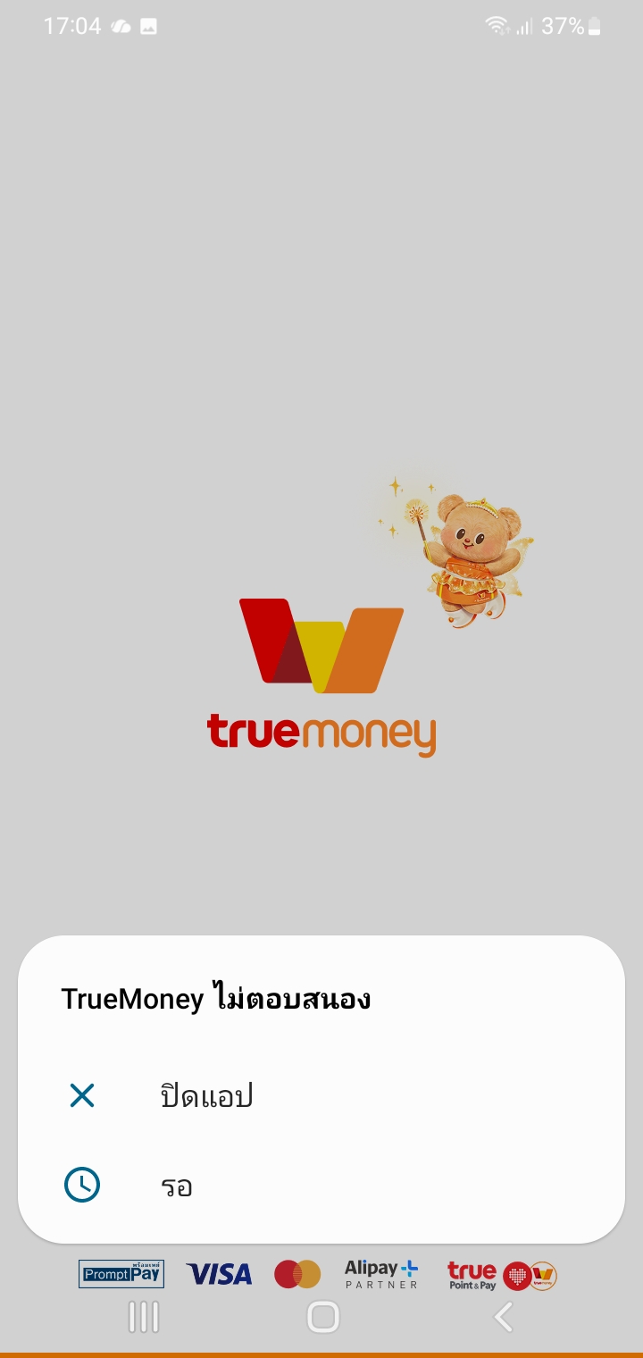 คือแต่ไหนแต่ไรก็เข้าได้ตามปกติเพิ่งจะเป็นเมื่อ 5 วันก่อน คือเข้าแอพไม่ได้เลย! จะค้างอยู่ตรงโลโก้เริ่มต้นกับรูปหมีเนยตลอด (ตามภาพประกอบ) แล้วก็จะมีข้อความ "แอพไม่ตอบสนอง" ขึ้นมา ก่อนหน้านี้ผมได้ลอง ลบแคสต์ , ลบประวัติท่องเว็บ , ลบแอพลงใหม่ , อัพเดทแอพเป็นเวอร์ชั่นล่าสุด , อัพเดทเพลย์สโตร์ , ปิด wifi แล้วใช้เน็ต 4G มือถือ ทำแม้กระทั่งล้างเครื่องด้วยโหมดโรงงาน! คือลบทุกอย่างจนเกลี้ยงจนเป็นเครื่องเปล่าโล้น ๆ แล้วลงแอพ True Money อย่างเดียว ครานั้นก็ยังเข้าไม่ได้ค้างอยู่ที่เดิม!