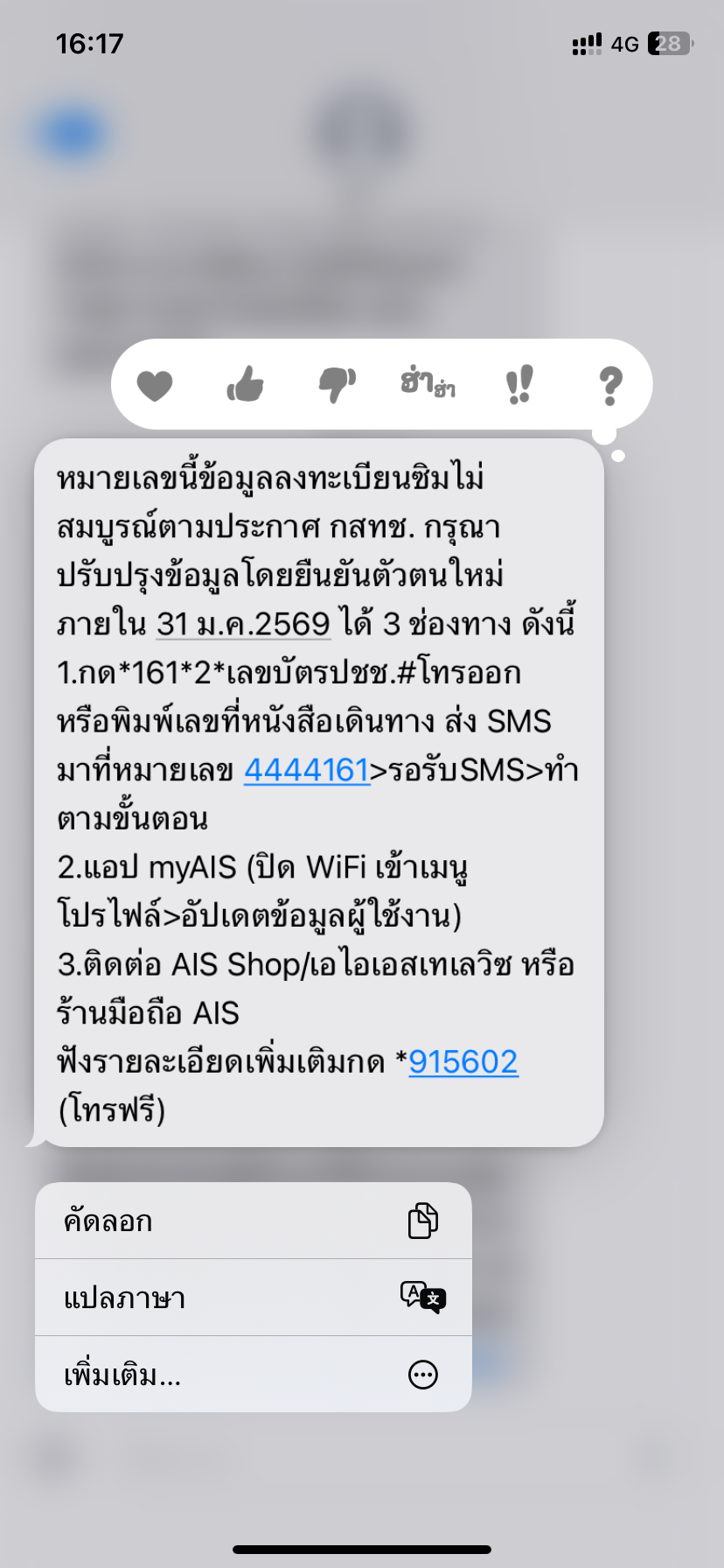 หมายเลขนี้ข้อมูลลงทะเบียนซิมไม่สมบูรณ์ตามประกาศ กสทช. กรุณาปรับปรุงข้อมูลโดยยืนยันตัวตนใหม่ ภายใน 31 ม.ค.2569 ได้ 3 ช่องทาง ดังนี้ 1.กด*161*2*เลขบัตรปชช.#โทรออก หรือพิมพ์เลขที่หนังสือเดินทาง ส่ง SMS ม