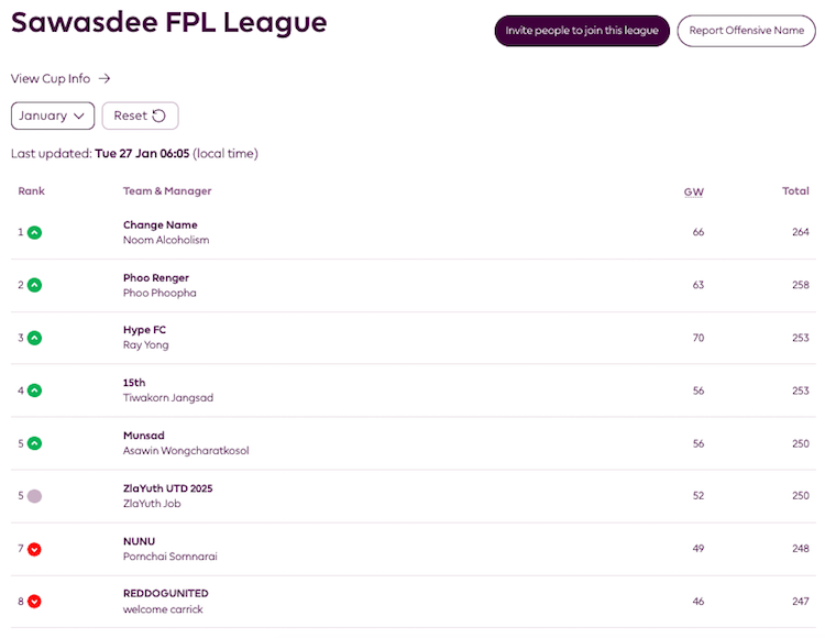 ตารางคะแนนเดือน ม.ค. ของ Sawasdee FPL League หลังจบ GW23