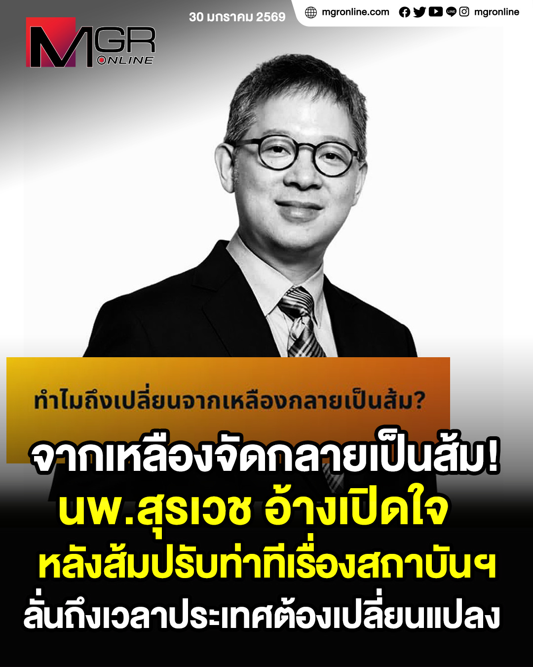 นพ.สุรเวช เผยจุดเปลี่ยนจากอดีตเหลืองจัดสู่กองเชียร์ส้ม เริ่มเปิดใจหลังส้มปรับท่าทีเรื่องสถาบันฯ บวกกับความล้มเหลวของรัฐบาลทหาร การสืบทอดอำนาจและคอร์รัปชั่นที่ฝังราก ลั่นประเทศไทยถึงเวลาต้องเปลี่ยนแปลงแล้ว