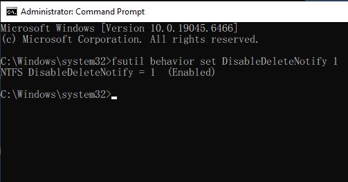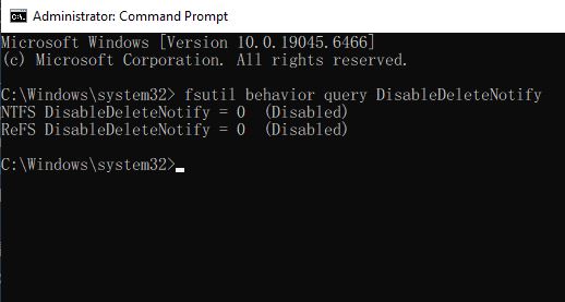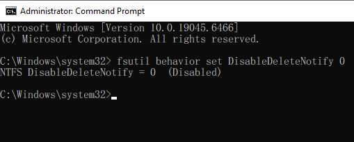 ถ้าเช็คแล้วมันปิดอยู่ ให้พิมพ์คำสั่งนี้เพื่อเปิดครับ: fsutil behavior set DisableDeleteNotify 0