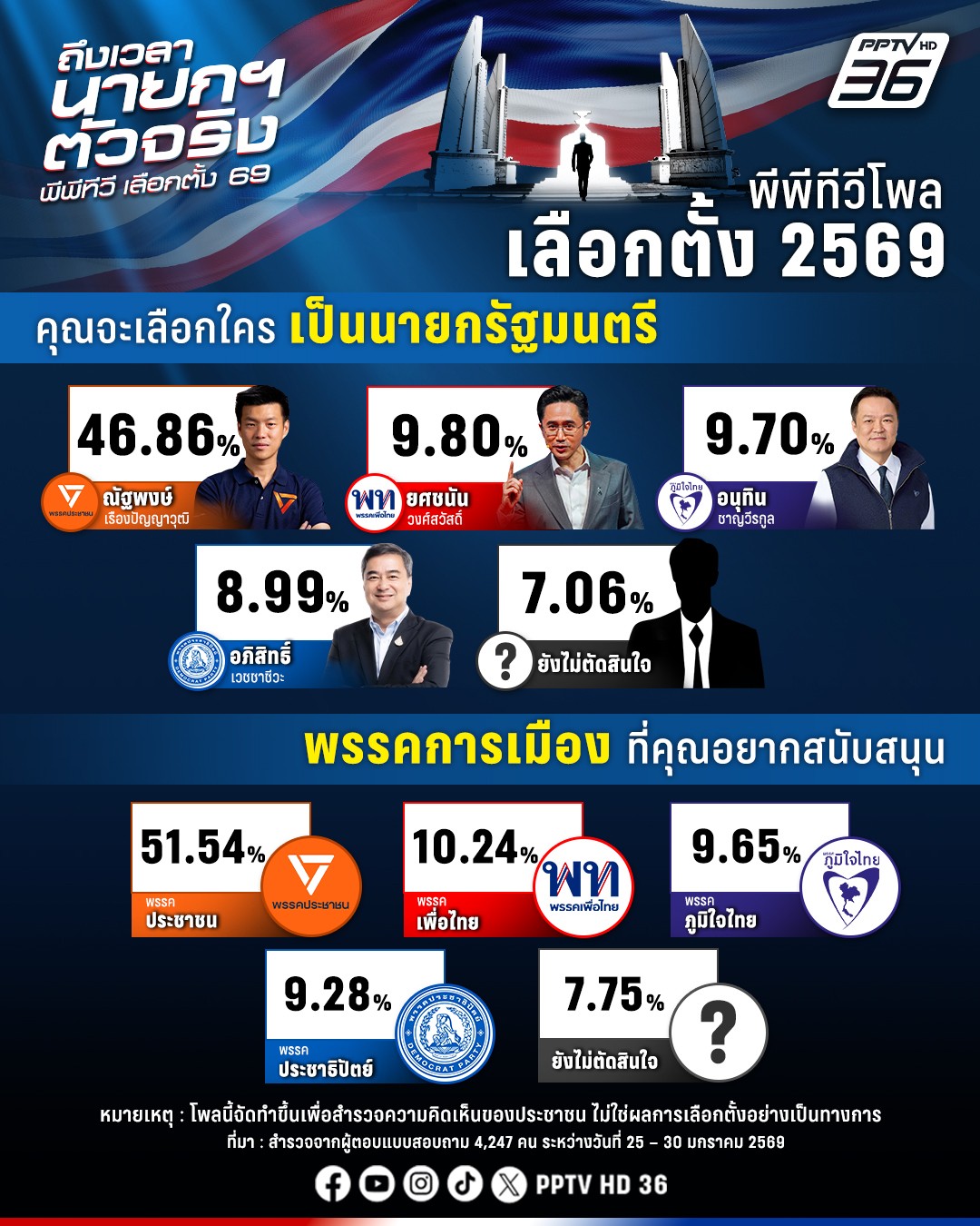 เกาะติด "เลือกตั้ง 2569" ผลสำรวจผู้ชม PPTV HD 36 และ PPTV Online โหวต "ณัฐพงษ์ เรืองปัญญาวุฒิ" นั่งนายกฯ 46.86% ส่วนพรรคที่อยากสนับสนุน "ประชาชน" 51.54%