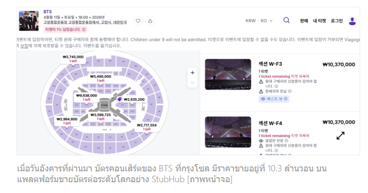 คอนเสิร์ตของ BTS ที่ชานเมืองโซลขายหมดเกลี้ยงในทันที แต่การขายตั๋วต่ออย่างผิดกฎหมายกำลังเฟื่องฟู ทำให้ราคาบางส่วนพุ่งสูงขึ้นเกือบ 40 เท่าของราคาหน้าตั๋ว
