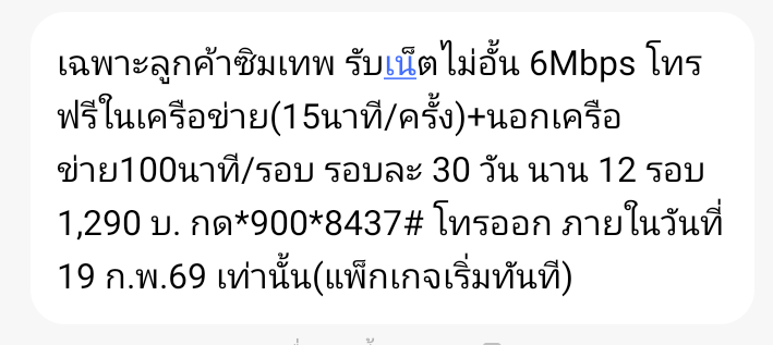 สวัสดีค่ะ พอดีได้รับข้อความ " ต่ออายุซิมเทพไม่ต้องซื้อซิมใหม่ สมัครแพ็กเน็ตไม่อั้น 6Mbps โทรฟรีในเครือข่ายไม่อั้น+เบอร์อื่นฟรี 100นาที/30วัน นาน 12 รอบ 1,290 บ. กด*900*8437# " เลยสงสัยว่าคื