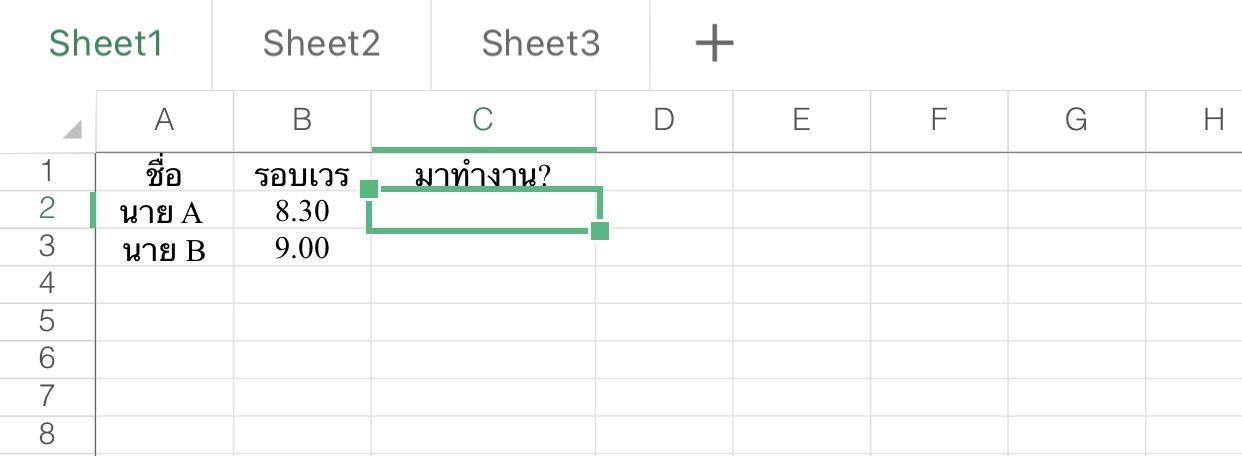 สูตรที่ต้องการ หากในชีท B มีรายชื่อตรงกับ ชีท A ให้ คอลัมน์ C แสดงผลว่ามาทำงาน หากไม่พบให้แสดงว่าขาดงาน