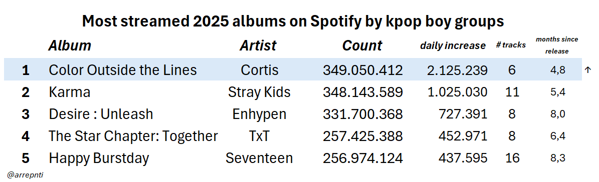 ภายในระยะเวลาประมาณเพียง 4 เดือน อัลบั้มเดบิวต์ “Color Outside the lLines” ของ Cortis ก็กลายเป็นอัลบั้มที่มียอดสตรีมมากที่สุดในปี 2025 ของ KPOP รุ่นที่ 5 ด้วยยอดสตรีม 276,925,579 ครั้งและย