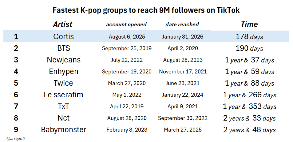 Cortis กลายเป็นวงเคป็อปที่ทำสถิติเร็วที่สุดในประวัติศาสตร์ที่มียอดผู้ติดตาม 9 ล้านคนบนอินสตาแกรม โดยใช้เวลาเพียง 155 วัน!! พวกเขายังคงเป็นบอยกรุ๊ปเจน 5 ที่มีผู้ติดตามมากที่สุดบนแพลตฟอร์มนี้!