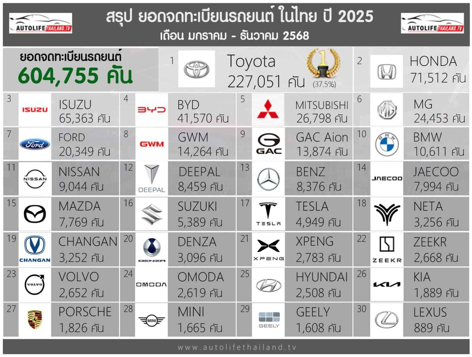 สรุป ยอดจดทะเบียนรถยนต์ ในไทย ปี 2025 รวม 604,755 คัน | Toyota อันดับ 1 ส่วนแบ่งตลาด 37.5%