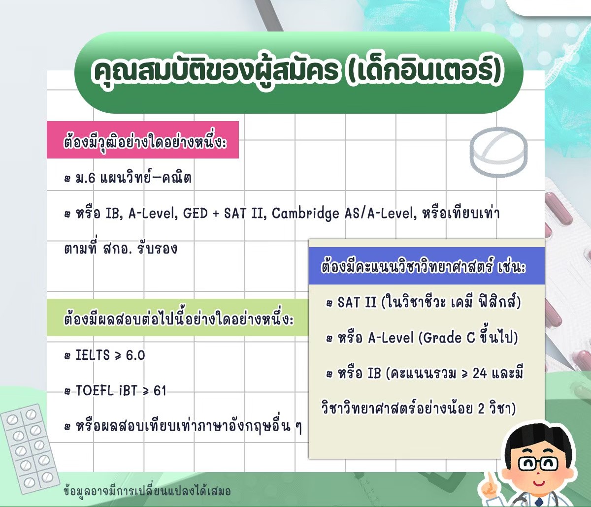 • วุฒิการศึกษา: ม.6 แผนวิทย์-คณิต หรือวุฒิเทียบเท่าอย่าง IB, A-Level, GED (ตามเกณฑ์ สกอ.)