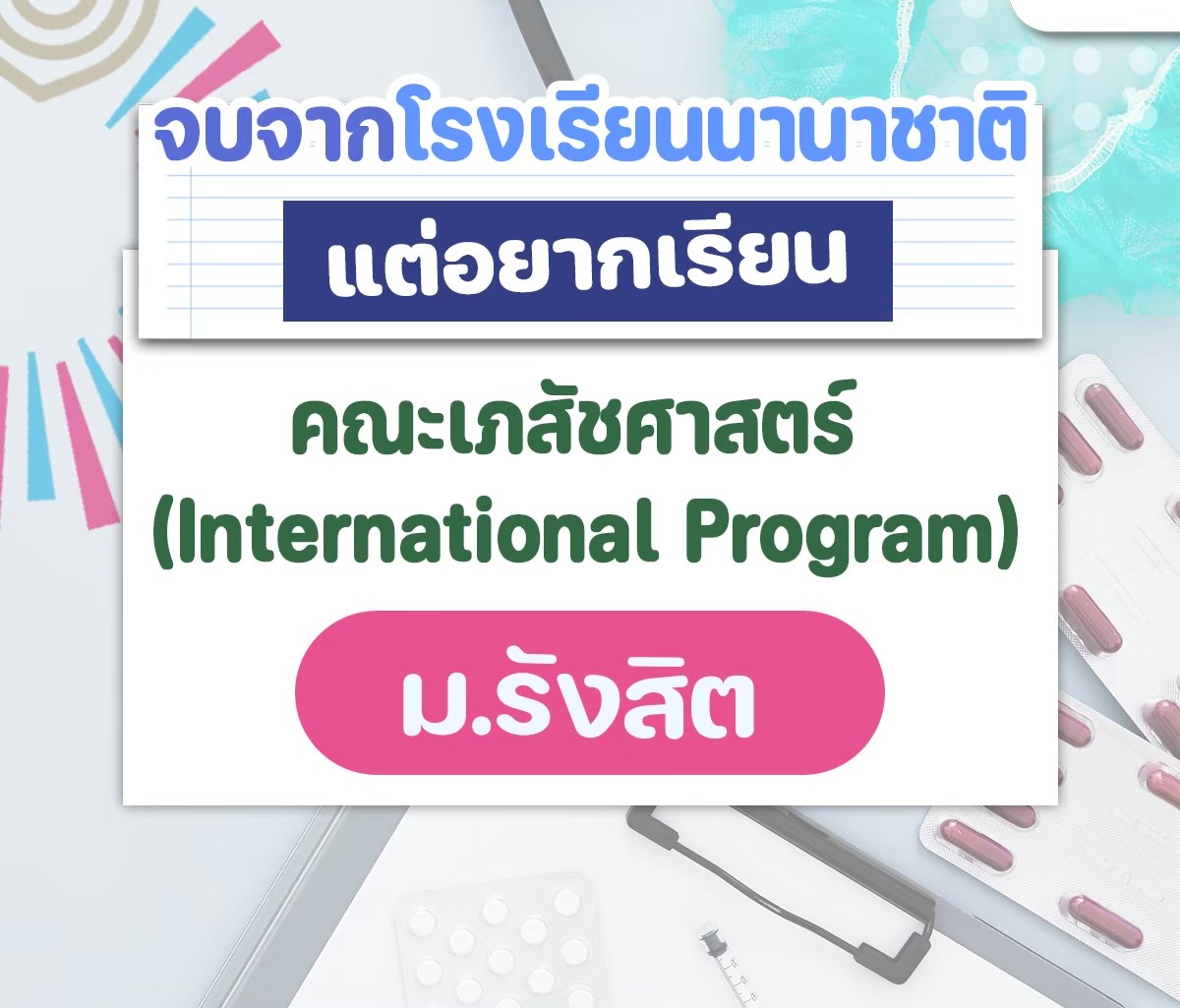 ใครว่าจบโรงเรียนนานาชาติหรือมีวุฒิ GED แล้วจะเรียนเภสัชฯ ไม่ได้? เลิกเชื่อความเชื่อเก่าๆ แล้วมาดูทางนี้! วันนี้จะพาไปทำความรู้จักกับ คณะเภสัชศาสตร์ (International Program) มหาวิทยาลัยรังสิต หลักสูตรที่ตอบโจทย์เด็กสายวิทย์-อินเตอร์ที่สุดในตอนนี้!