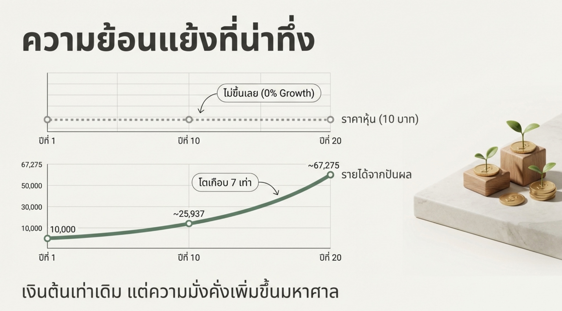เส้นล่างคือรายได้จากปันผล ที่ค่อย ๆ โตจาก 10,000 เป็น 25,937 และกลายเป็น 67,275 ในปีที่ 20 ทั้งที่ราคาหุ้นไม่ขยับเลยแม้แต่บาทเดียว ความมั่งคั่งในภาพนี้ไม่ได้เกิดจากการคาดเดา ไม่ได้เกิดจากการจับจังหวะ ไม่ได้เกิดจากการซื้อถูกขายแพง แต่มาจาก “การทำสิ่งเดิมซ้ำ ๆ อย่างมีวินัย” และปล่อยให้เวลาเป็นแรงงานหลัก