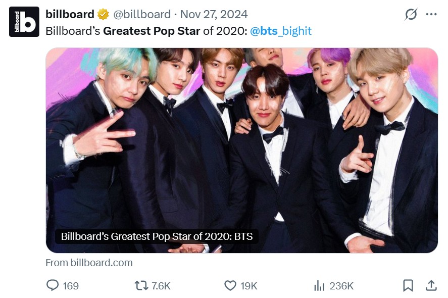 NSYNC เคยได้รับตำแหน่งนี้ในปี 2000 โดย BTS คว้าฉายานี้มาครองได้ในปี 2020