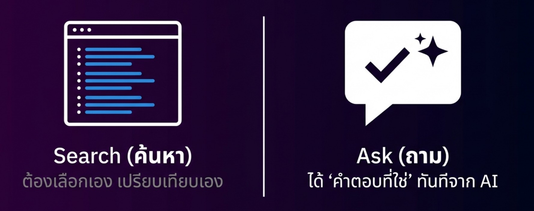 ลองนึกภาพตามนะครับ เมื่อก่อนเวลาเราต้องการหาข้อมูลอะไรสักอย่าง เราจะเปิด Google แล้วพิมพ์ "คำค้นหา" ยาว ๆ หรือสั้น ๆ ลงไป จากนั้นเราต้องไล่ดูผลลัพธ์ตั้งแต่หน้า 1 ไล่ลงมาถึงหน้า 2 หน้า 3 เพื่อเปรียบเทียบและตัดสินใจว่าเว็บไซต์ไหนให้ข้อมูลที่น่าเชื่อถือที่สุด