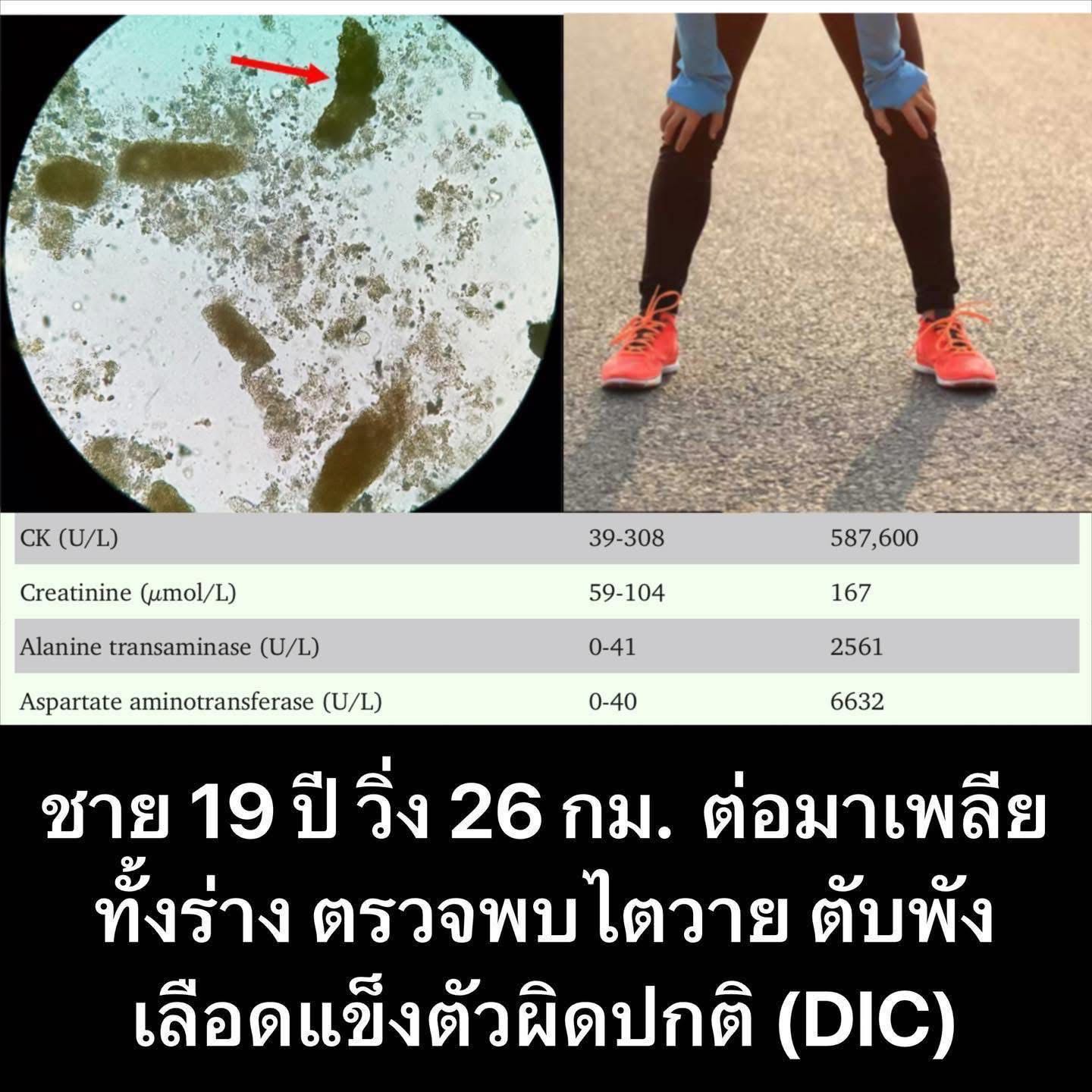 ชาย 19 ปี แข็งแรงดี วิ่งจ็อกกิ้ง 26 กม. ต่อมาเพลีย มีตะกอนผิดปกติในปัสสาวะ ตรวจพบไตวายเฉียบพลัน ตับบาดเจ็บ เลือดแข็งตัวผิดปกติ