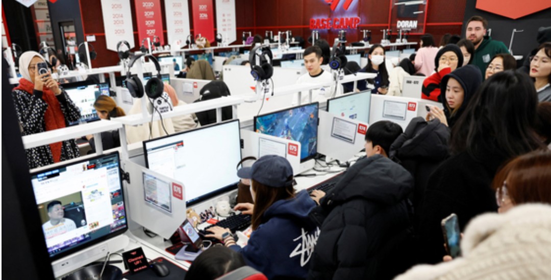 ผู้คนมารวมตัวกันด้านหลังแฟนคลับวงบอยแบนด์ BTS ที่พยายามจองตั๋วคอนเสิร์ตครั้งแรกในรอบหลายปีของวงในเกาหลี ที่ร้านอินเทอร์เน็ตคาเฟ่แห่งหนึ่งในกรุงโซล เมื่อวันที่ 22 มกราคม