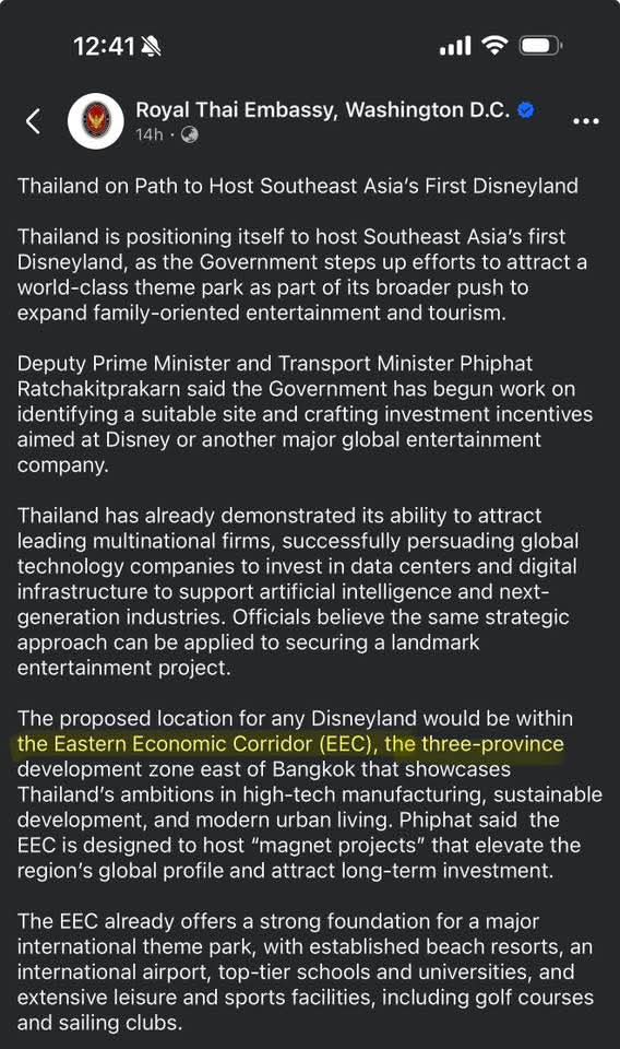 “ไทยลุ้นแลนด์ดิสนีย์แห่งแรกอาเซียน! รัฐบาลเล็ง EEC รับโปรเจกต์ยักษ์ ดันชลบุรี–ฉะเชิงเทรา–ระยอง ขึ้นฮับความบันเทิงโลก”