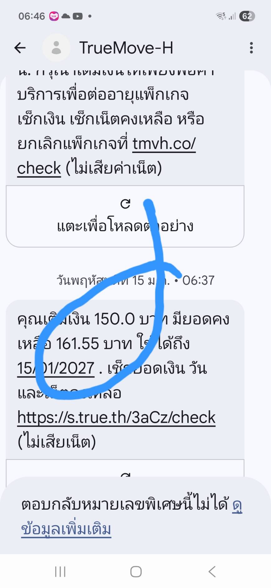 เติมเงินไปวันที่ 15 ม.ค.2569 จำนวน 150 บาท (รวมยอดที่ค้าง ก็จะเป็น 161.55 บาท )