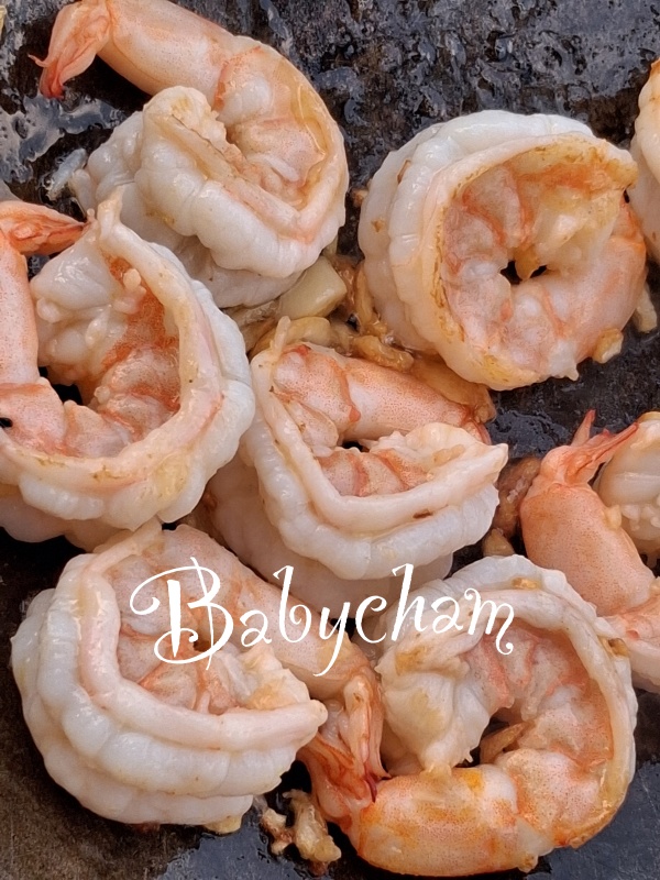กุ้งเด้งแม้จะตัวใหญ่มากๆ แต่เอาออกมาจากฟรีซแล้ว ก็ต้องใช้ให้หมดค่ะ ตั้งกะทะร้อนใส่น้ำมันแล้วใส่กระเทียมสับลงไป ตามด้วยกุ้งค่ะ ผัดพอสุก