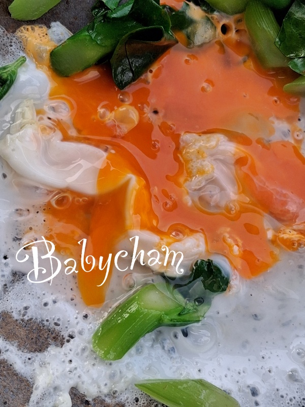 แล้วตอกไข่ใส่ลงไป ไข่เป็ดเจ้านี้สีแดงสวยมากๆ เร่งไฟขึ้นนิดนึง แล้วใส่ผักลงไป