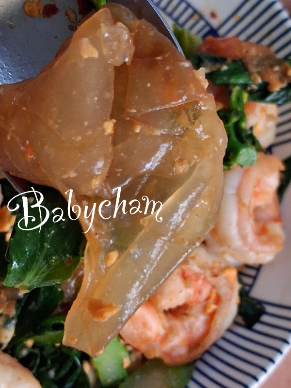 นำมาลอกเปลือกโคนออก ทำการตัดแต่ง ได้ก้านใสๆแบบนี้ เอาไปทำเมนูอะไรก็อร่อย
