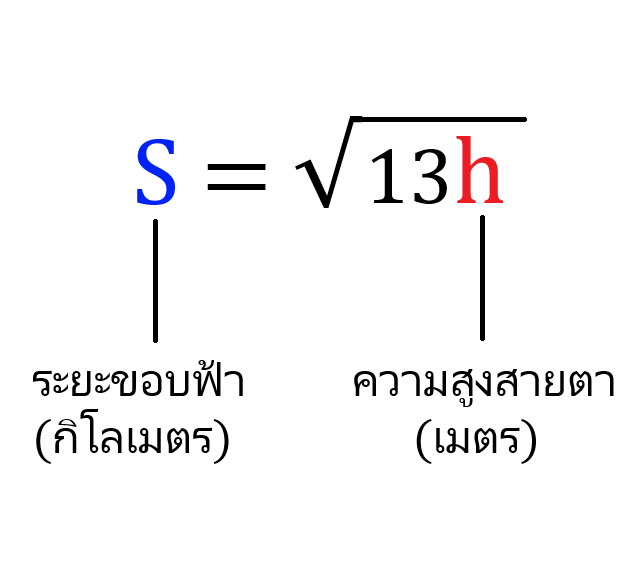 อย่างกรณีเรายืนบนฝั่ง .... หากเราสูง 1.75 เมตรจะได้ว่าระยะขอบฟ้าที่เราเห็นในทะเลคือ 4.77 กิโลเมตร ดังนั้น ก็หมายความว่าถ้าแหล่งน้ำนั้นมีความกว้างของพื้นดินถึงอีกฝั่งหนึ่งมากกว่าประมาณ 5 กิโลเมตรขึ้นไป เราก็จะไม่เห็นแผ่นดินในฝั่งตรงข้าม ก็คือเห็นแต่ผืนน้ำเพียงอย่างเดียวซึ่งก็เหมือนกับเรามองออกไปในทะเลครับ