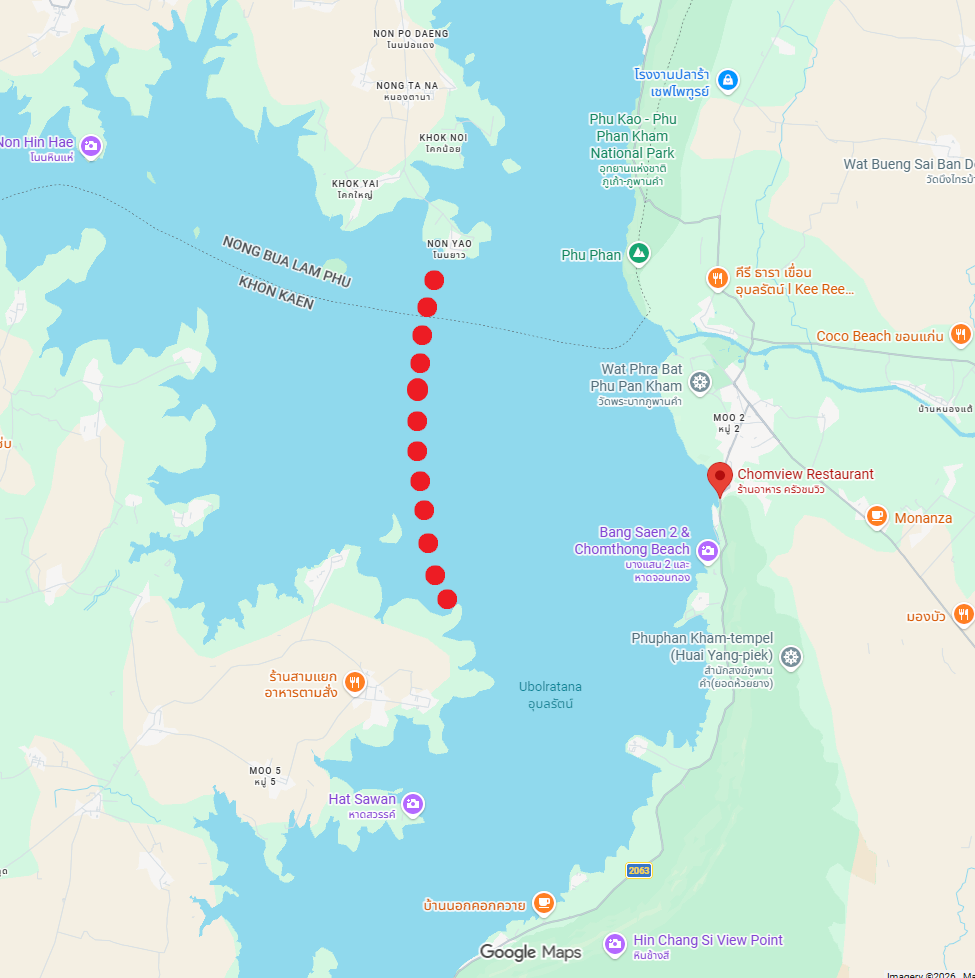 ขอยกตัวอย่างเขื่อนอุบลรัตน์ครับ จากร้านอาหารครัวชมวิว (ที่ปักหมุดสีแดงไว้) จนถึงจุดสีแดงเรียงเป็นแถวนั้นคือระยะทางประมาณ 6 กิโลเมตร