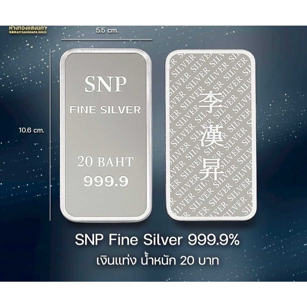 เงินแท่งสำหรับสายออมและสายสะสมที่ชอบของจับต้องได้ เลือก เงินแท่ง 999.9 SNP ได้ทั้งขนาด 10 บาทและ 20 บาท เหมาะกับการทยอยเก็บเป็นสินทรัพย์แบบพกพาง่าย งานปั๊มโลโก้ SNP ด้านหน้าชัดเจน และมีตราร้านภาษาจีนด้านหลังช่วยยืนยันแหล่งที่มา พร้อมใบประกันเพิ่มความมั่นใจเวลาเก็บสะสมหรือส่งต่อ