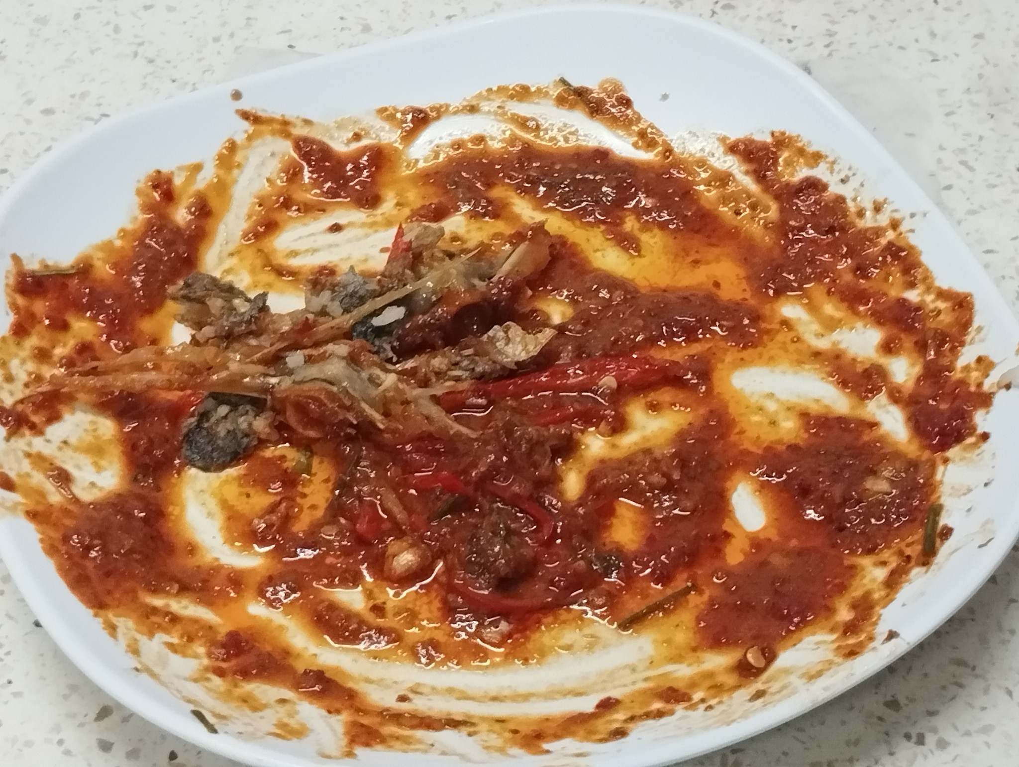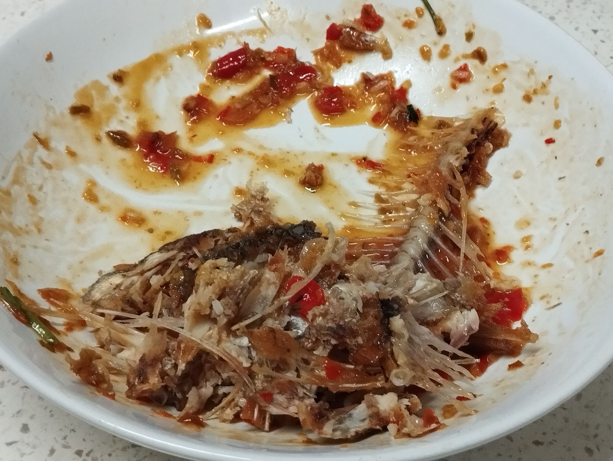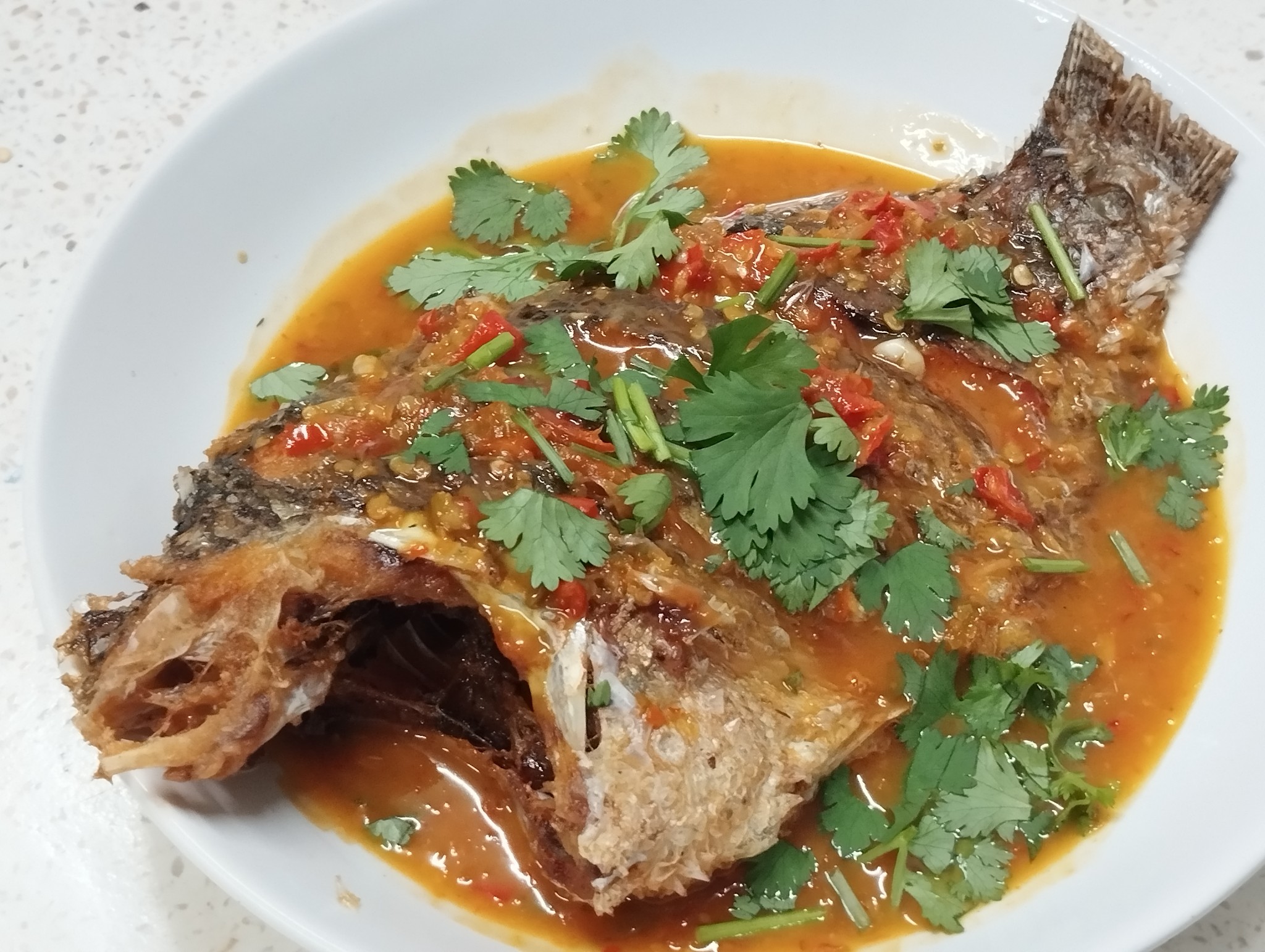 ส่วนมื้อเย็นเมื่อวานก็ซ้ำกับเมนูเดิม ปลานิลทอดกรอบราดพริกสามรส เผ็ด เปรี้ยว หวาน