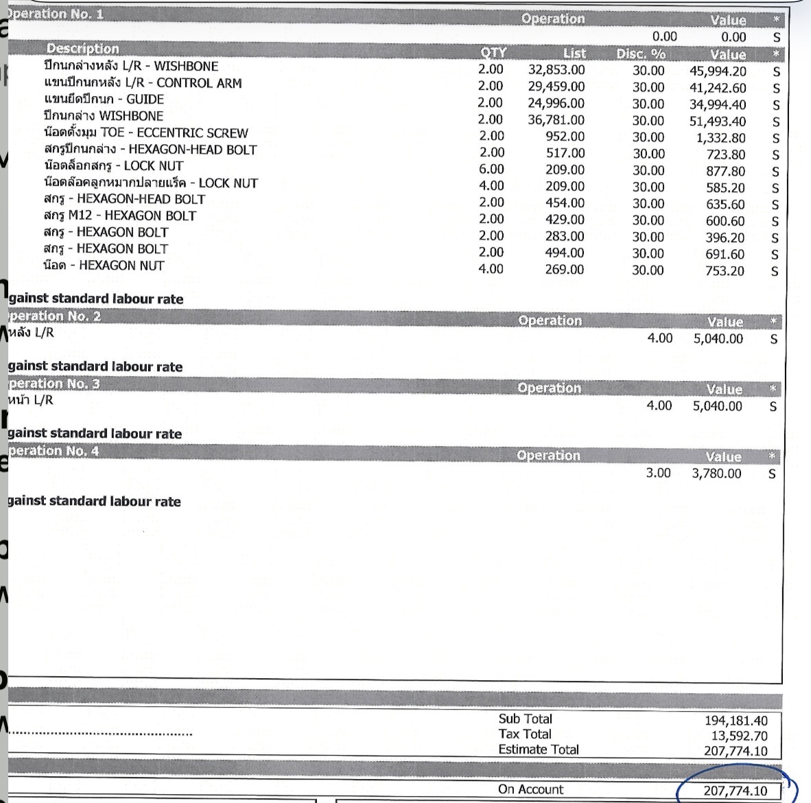 ผลคือ เค้าเสนออะไหล่ที่ควรเปลี่ยน สี่อย่างหลักของชุดช่วงล่างหลัง ซ้ายขวารวม8 ชิ้น กับ พวกสกรูต่างๆสำหรับอุปกรณ์นั้น รวมค่าอะไหล่ และค่าแรง หลังลด 30% ในฐานะรถออกศูนย์ แล้ว เหลือ 2 แสนกว่าบาท