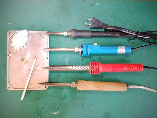 ภาพหัวแร้งที่ผมใช้งานอยู่ตอนนี้ ด้ามไม้ใช้จี้พลาสติก/กาวแท่ง ด้ามแดงใช้งานทั่วไป ด้ามสีฟ้าใช้งานบัดกรีบนแผ่นปริ๊น ด้ามสีดำใช้กับอุปกรณ์ที่มีขนาดเล็ก แยกการใช้งานไม่ต้องสลับปลายขณะใช้