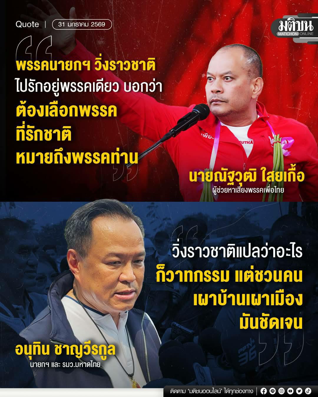 “ณัฐวุฒิ” ฟาดกลับ “อนุทิน” วิ่งราวชาติไปรักอยู่พรรคเดียว ผลักไสคนอื่นเป็นฝั่งตรงข้าม ชี้หวังผลการเมือง แต่สร้างความแตกแยกทางสังคม สงสัย “รมต.กัมพูชา” ช่วยหาคะแนนหรือไม่ ซัดไม่ฟังแดดดี้ แต่ฟังครูใหญ่ทะเบียนบ้านอยู่เขากระโดง คนรู้ทั้งประเทศ เล่นนอกกติกา ซ้ำเติมคนอยู่ในห้องขัง