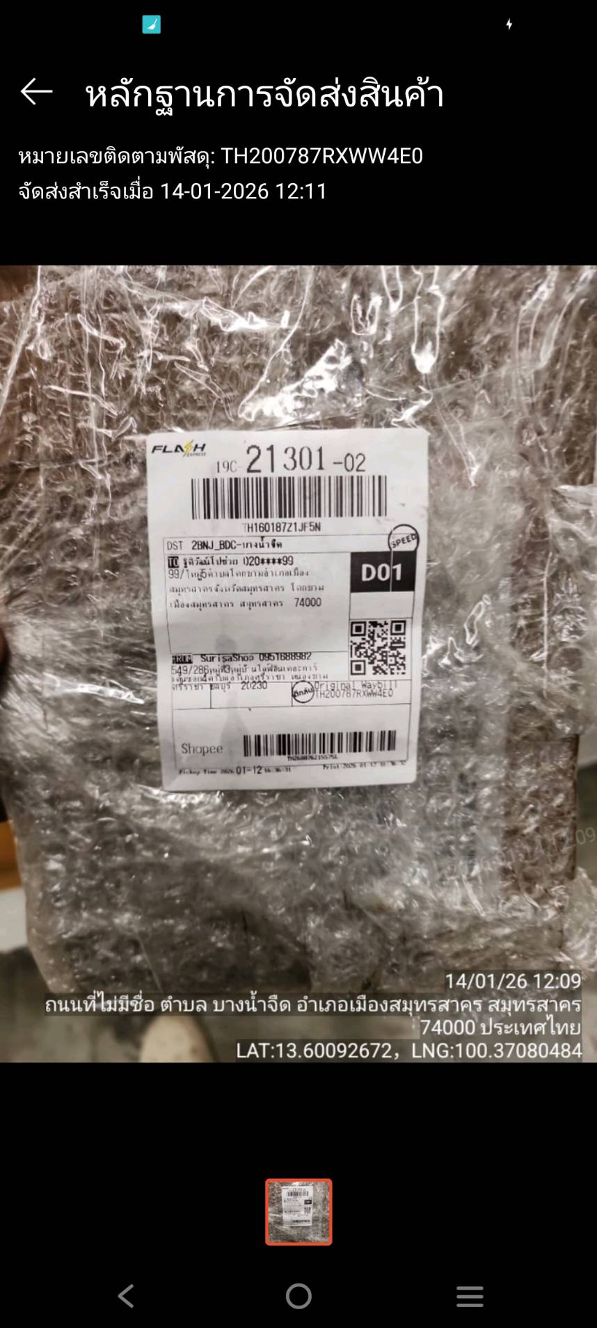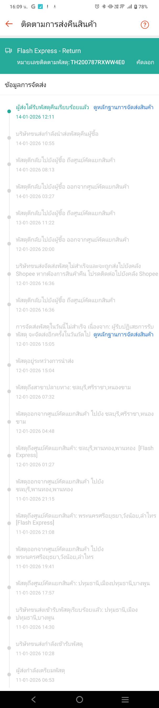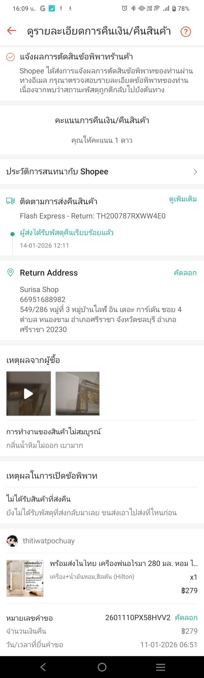 - วันที่ 21 มกราคม 2569 ทาง Shopee โทรมาถามว่า ยังไม่ได้รับสินค้าที่ตีคืนใช่ไหม ก็ตอบไปว่ายังไม่ไดรับ วันนี้จะมีขนส่งเอาเข้าไปคืนนะ ก็บอกเอามาส่งเลย เลิกงานจะไปดู ตอนเย็นหลังเลิกงานกลับมา เห็นถุงพัสดุมาวางหน้าบ้าน ยกขึ้นคือแบบเบามาก ผู้ส่ง คือ Shopee ขนส่ง SPX แค่ยกขึ้นก็รู้แล้วว่าสภาพไม่เหลือชิ้นดีแน่นอน ก็มาอัดคลิปเปิดซอง เปิดกล่องที่อยู่ในซองนั้นอีกที และก็ส่งหลักฐานให้ Shopee ทางช่องแชทเป็นภาพถ่าย เนื่องจากวีดีโอที่อัดไว้ไฟล์ภาพมันใหญ่เกินไปที่จะส่งได้ แล้วก็แจ้งไว้ใต้แชทว่า ถาอยากได้วีดีโอแจ้งมานะ
