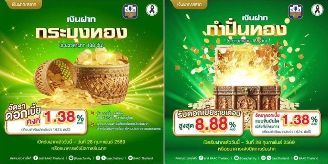 ในช่วงเดือนแรกของปี 2569 พบว่า ธนาคารเพื่อการเกษตรและสหกรณ์(ธ.ก.ส.) เปิดตัว 2 เงินฝากใหม่ “กำปั่นทอง” รับดอกเบี้ยแบบขั้นบันไดสูงสุด ร้อยละ 8.88 ต่อปี และ “กระบุงทอง” รับดอกเบี้ยทุกเดือน ร้อยละ 1.38 ต่อปี ระยะเวลาฝาก 188 วัน