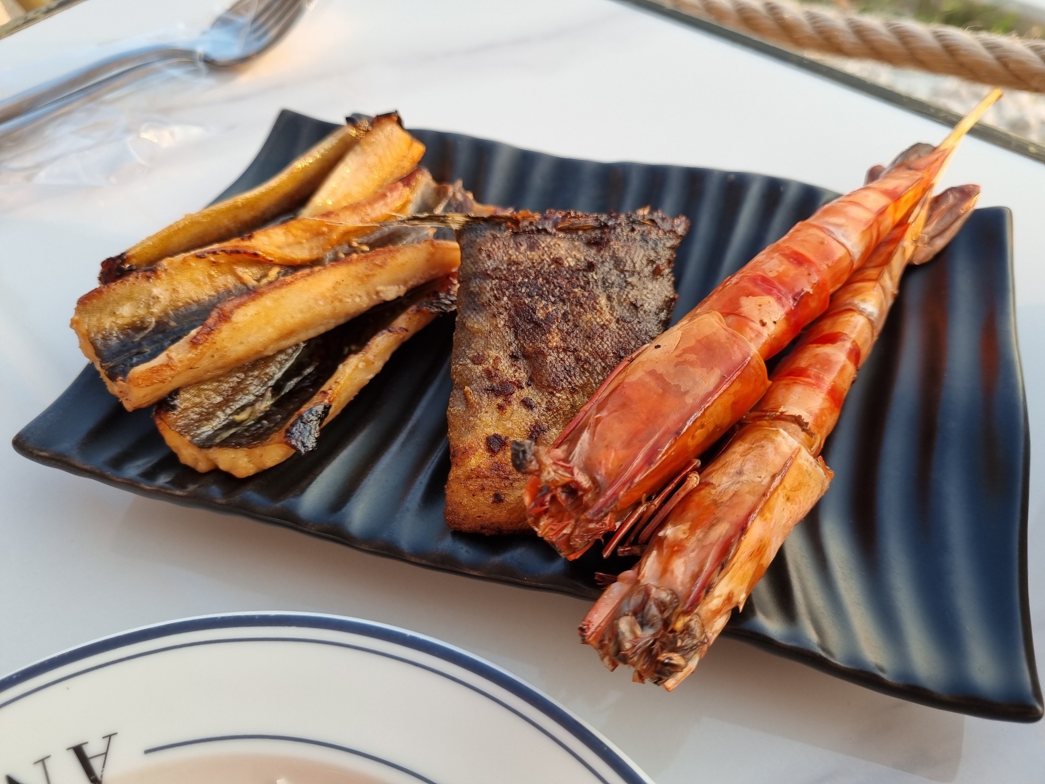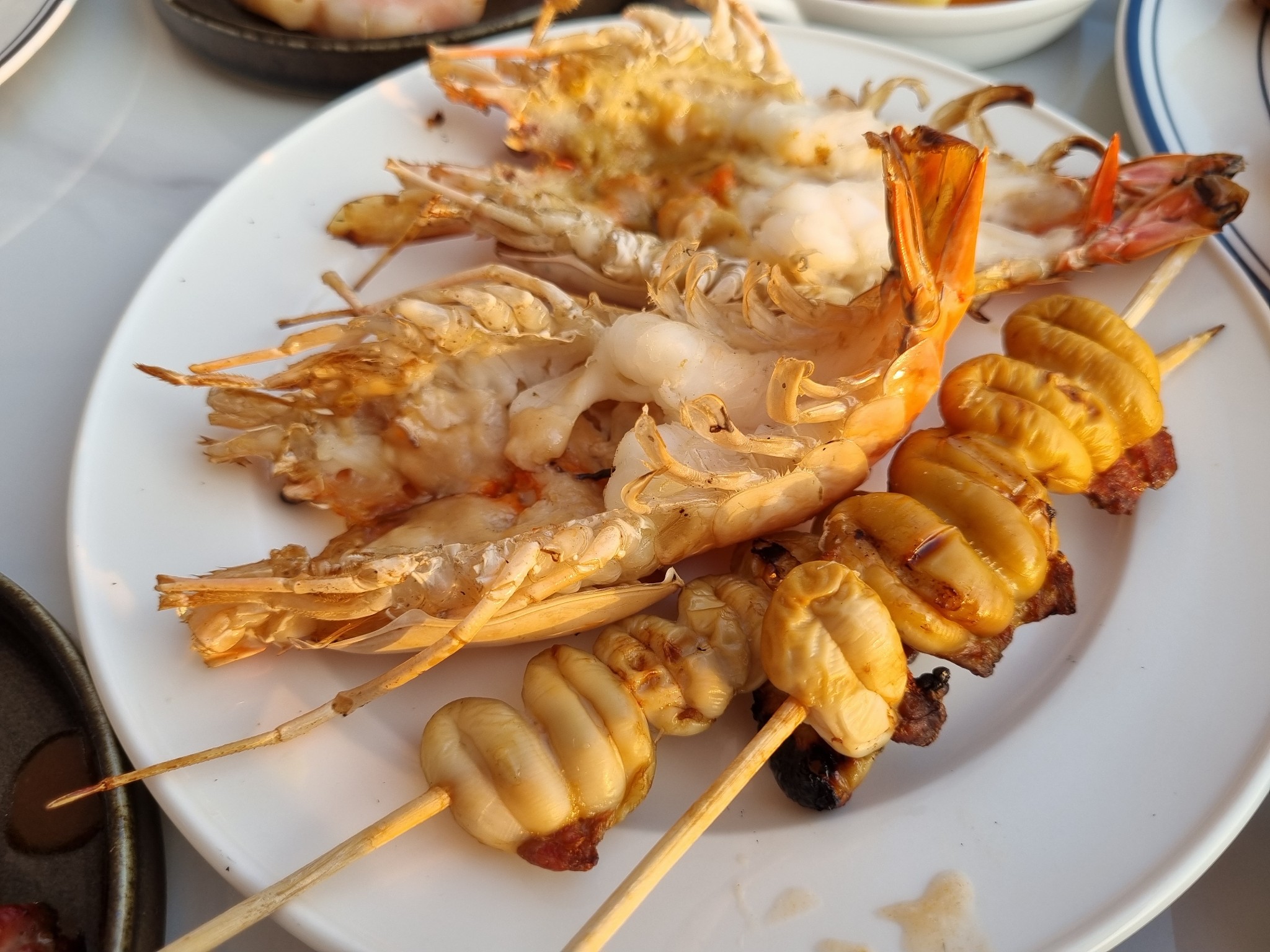 กุ้งลายเสือเสียบไม้ เนื้อเปื่อยเป็นครีม เคี้ยวๆแล้วแห้งปลาย หวานจางๆ สู้แบบผ่าหลังไม่ได้
