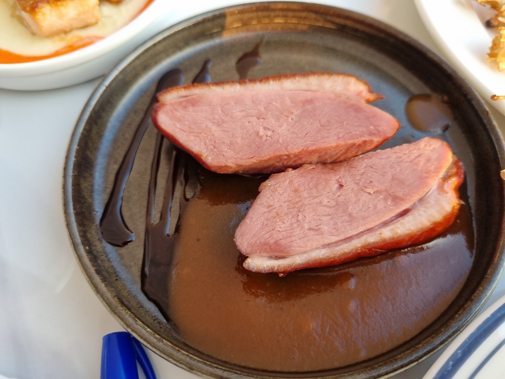 เป็ดรมควันย่าง เนื้อเป็ดแน่นละเอียด นุ่มหอม หนังกรอบมันน้องๆเป็ดปักกิ่ง ซอสราดเป็นบาร์บีคิวผสมส้มที่กลิ่นไม่แรงจนเกินไป